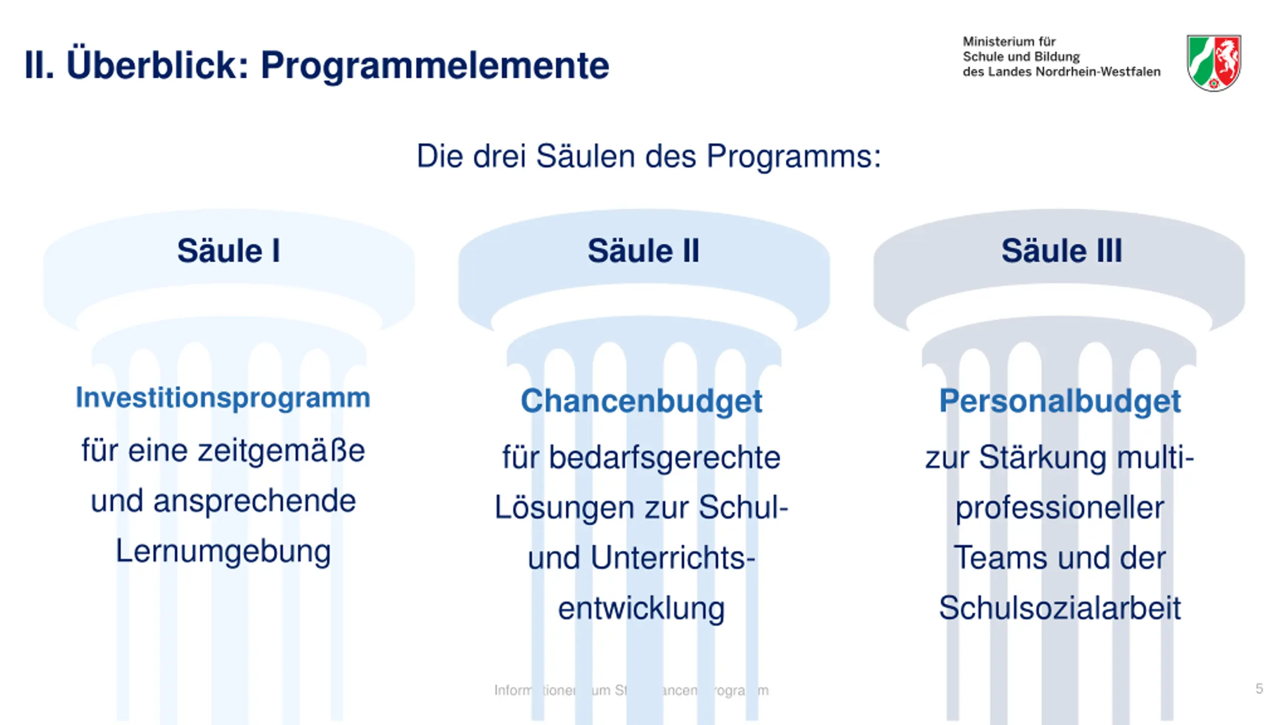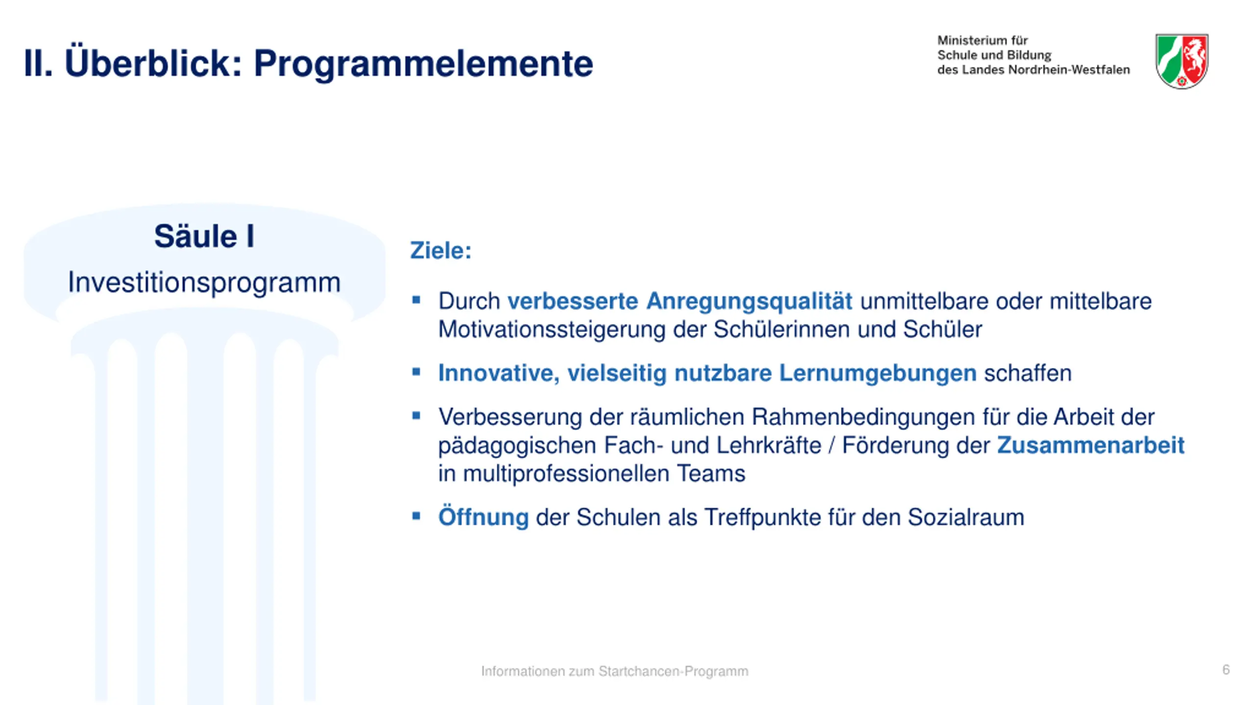 II. berblick: Programmelemente Die drei S ulen des Programms: S ule I S ule II S ule III Investitionsprogramm Chancenbudget Personalbudget f r eine zeitgem e und ansprechende Lernumgebung f r bedarfsgerechte L sungen zur Schul- und Unterrichts- entwicklung zur St rkung multi- professioneller Teams und der Schulsozialarbeit 5 Informationen zum Startchancen-Programm