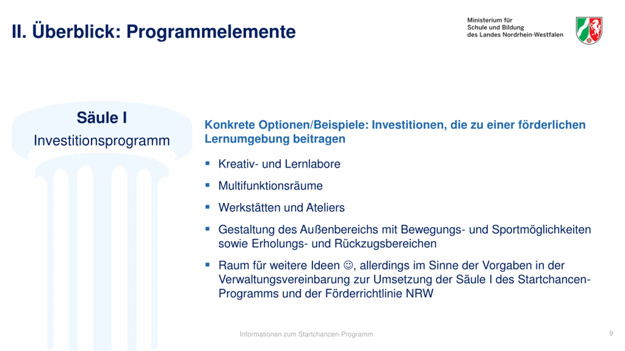 II. berblick: Programmelemente S ule I Konkrete Optionen/Beispiele: Investitionen, die zu einer f rderlichen Lernumgebung beitragen Investitionsprogramm Kreativ- und Lernlabore Multifunktionsr ume Werkst tten und Ateliers Gestaltung des Au enbereichs mit Bewegungs- und Sportm glichkeiten sowie Erholungs- und R ckzugsbereichen Raum f r weitere Ideen , allerdings im Sinne der Vorgaben in der Verwaltungsvereinbarung zur Umsetzung der S ule I des Startchancen- Programms und der F rderrichtlinie NRW 9 Informationen zum Startchancen-Programm