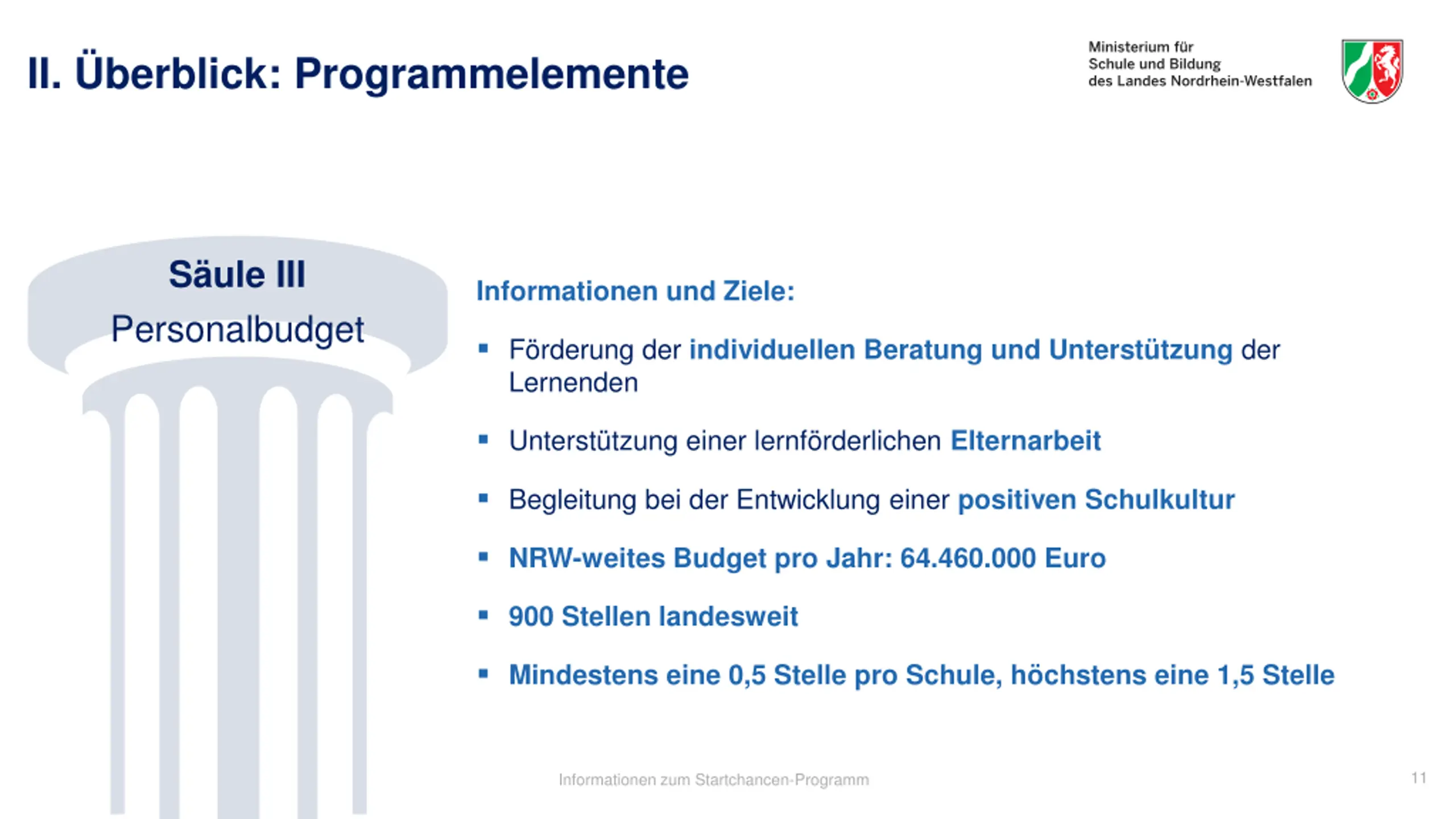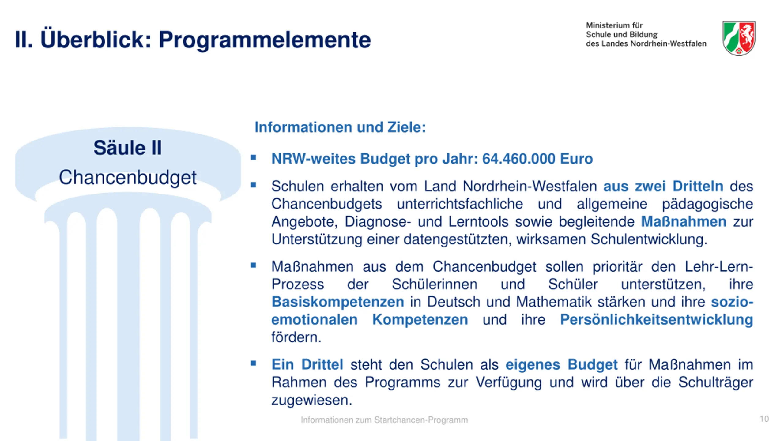 II. berblick: Programmelemente Informationen und Ziele: S ule II NRW-weites Budget pro Jahr: 64.460.000 Euro Chancenbudget Schulen erhalten vom Land Nordrhein-Westfalen aus zwei Dritteln des Chancenbudgets unterrichtsfachliche Angebote, Diagnose- und Lerntools sowie begleitende Ma nahmen zur Unterst tzung einer datengest tzten, wirksamen Schulentwicklung. und allgemeine p dagogische Ma nahmen aus dem Chancenbudget sollen priorit r den Lehr-Lern- Prozess der Sch lerinnen und Basiskompetenzen in Deutsch und Mathematik st rken und ihre sozio- emotionalen Kompetenzen und f rdern. Sch ler unterst tzen, ihre ihre Pers nlichkeitsentwicklung Ein Drittel steht den Schulen als eigenes Budget f r Ma nahmen im Rahmen des Programms zur Verf gung und wird ber die Schultr ger zugewiesen. 10 Informationen zum Startchancen-Programm