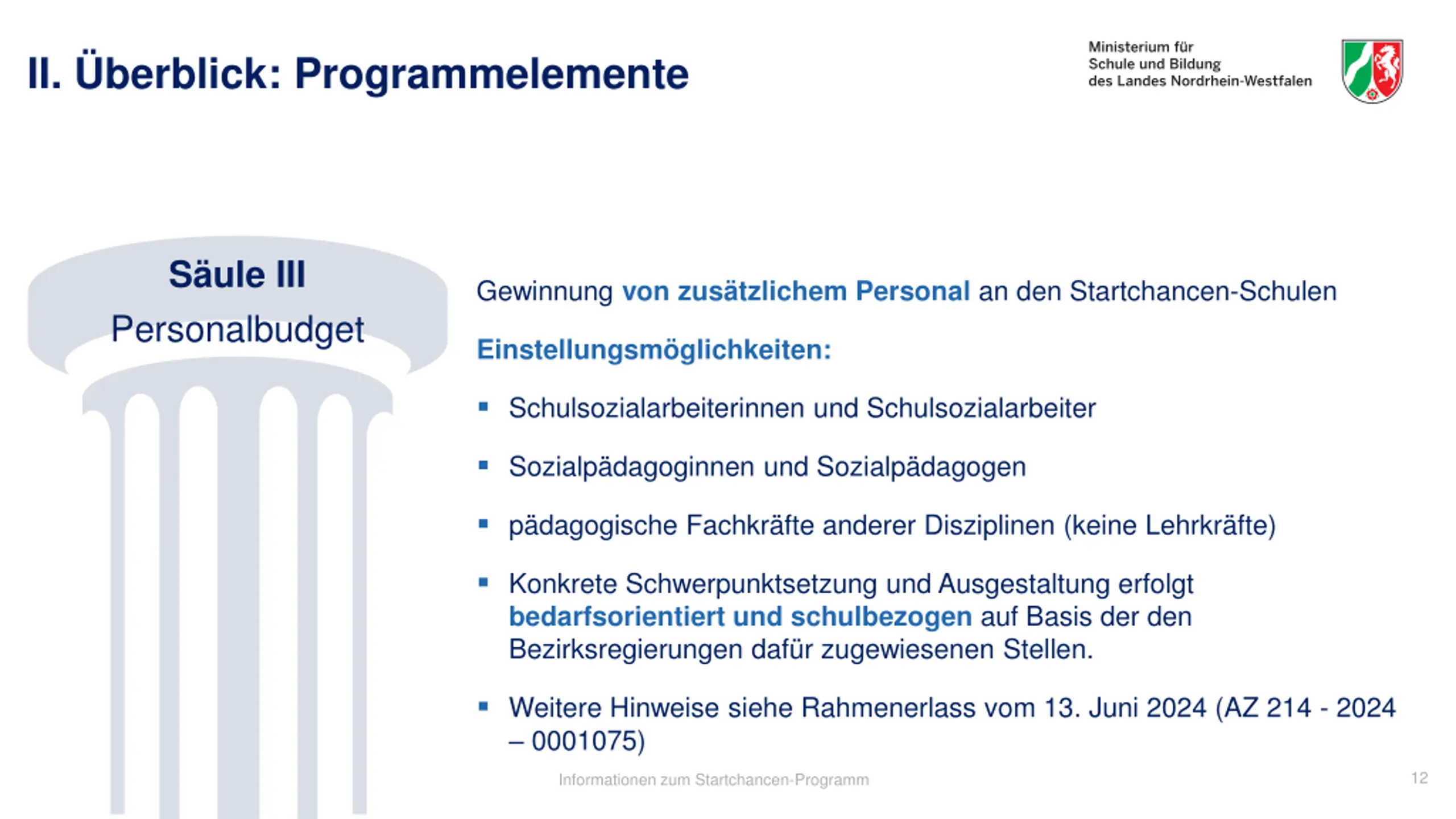 II. berblick: Programmelemente S ule III Personalbudget Gewinnung von zus tzlichem Personal an den Startchancen-Schulen Einstellungsm glichkeiten: Schulsozialarbeiterinnen und Schulsozialarbeiter Sozialp dagoginnen und Sozialp dagogen p dagogische Fachkr fte anderer Disziplinen (keine Lehrkr fte) Konkrete Schwerpunktsetzung und Ausgestaltung erfolgt bedarfsorientiert und schulbezogen auf Basis der den Bezirksregierungen daf r zugewiesenen Stellen. Weitere Hinweise siehe Rahmenerlass vom 13. Juni 2024 (AZ 214 - 2024 0001075) 12 Informationen zum Startchancen-Programm