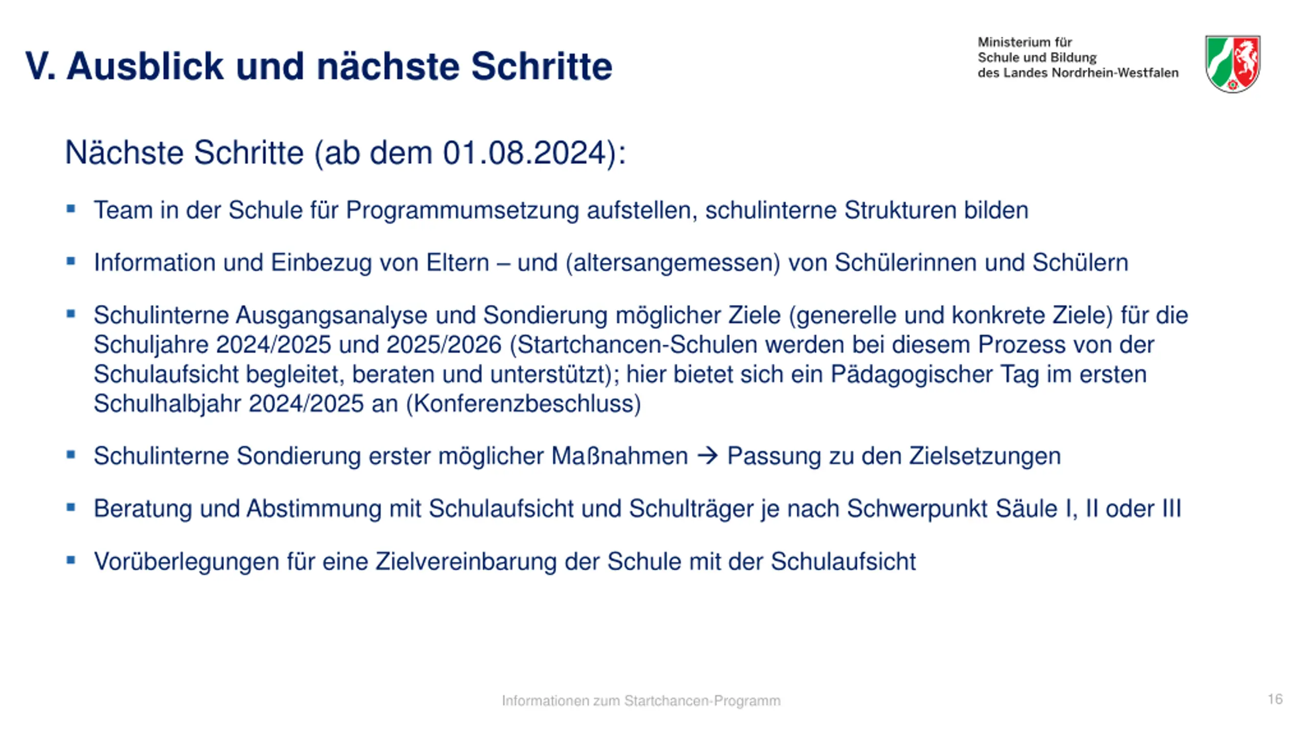 V. Ausblick und nchste Schritte N chste Schritte (ab dem 01.08.2024): Team in der Schule f r Programmumsetzung aufstellen, schulinterne Strukturen bilden Information und Einbezug von Eltern und (altersangemessen) von Sch lerinnen und Sch lern Schulinterne Ausgangsanalyse und Sondierung m glicher Ziele (generelle und konkrete Ziele) f r die Schuljahre 2024/2025 und 2025/2026 (Startchancen-Schulen werden bei diesem Prozess von der Schulaufsicht begleitet, beraten und unterst tzt); hier bietet sich ein P dagogischer Tag im ersten Schulhalbjahr 2024/2025 an (Konferenzbeschluss) Schulinterne Sondierung erster m glicher Ma nahmen Passung zu den Zielsetzungen Beratung und Abstimmung mit Schulaufsicht und Schultr ger je nach Schwerpunkt S ule I, II oder III Vor berlegungen f r eine Zielvereinbarung der Schule mit der Schulaufsicht 16 Informationen zum Startchancen-Programm