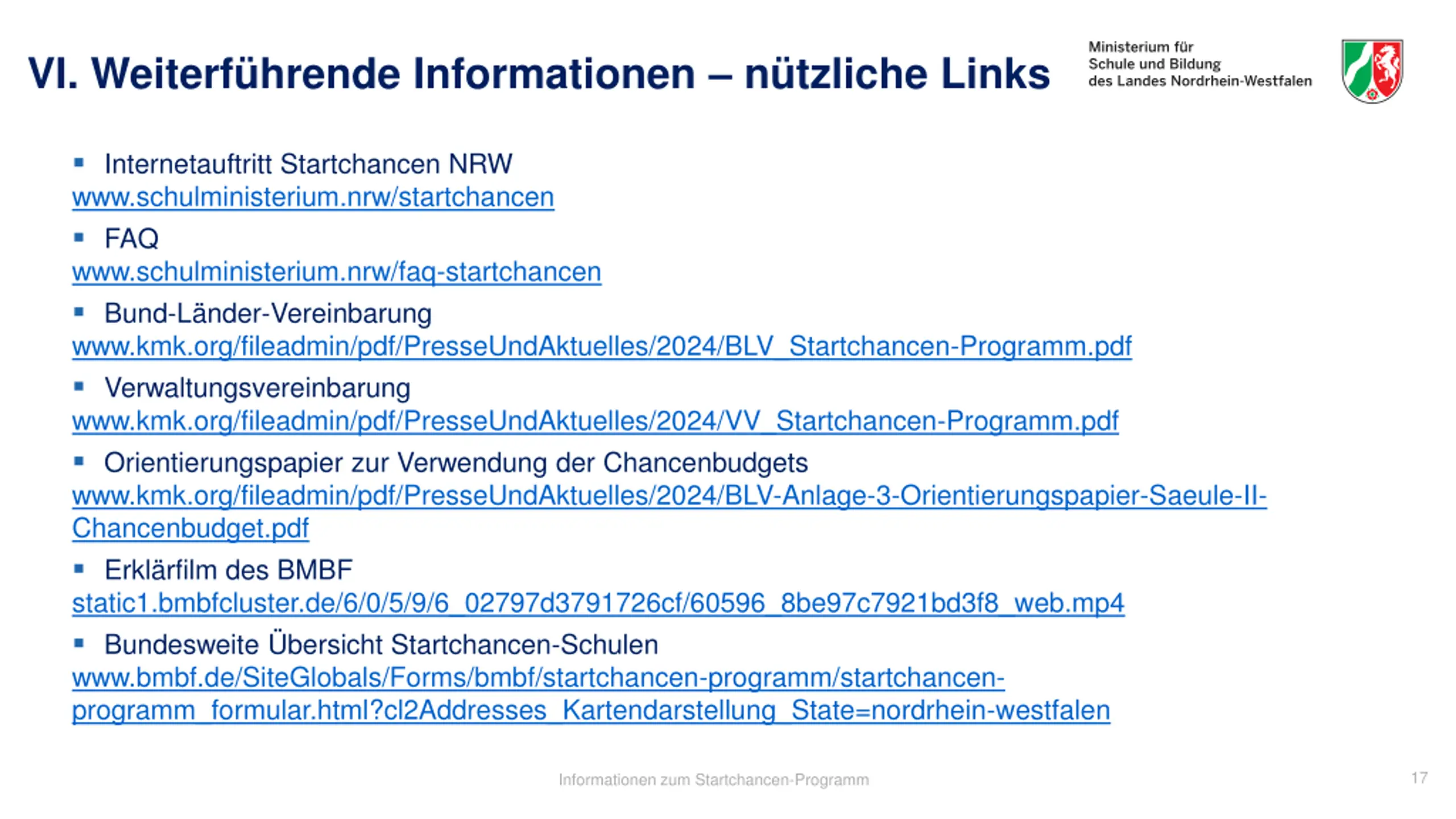 VI. Weiterfhrende Informationen ntzliche Links Internetauftritt Startchancen NRW www.schulministerium.nrw/startchancen FAQ www.schulministerium.nrw/faq-startchancen Bund-L nder-Vereinbarung www.kmk.org/fileadmin/pdf/PresseUndAktuelles/2024/BLV_Startchancen-Programm.pdf Verwaltungsvereinbarung www.kmk.org/fileadmin/pdf/PresseUndAktuelles/2024/VV_Startchancen-Programm.pdf Orientierungspapier zur Verwendung der Chancenbudgets www.kmk.org/fileadmin/pdf/PresseUndAktuelles/2024/BLV-Anlage-3-Orientierungspapier-Saeule-II- Chancenbudget.pdf Erkl rfilm des BMBF static1.bmbfcluster.de/6/0/5/9/6_02797d3791726cf/60596_8be97c7921bd3f8_web.mp4 Bundesweite bersicht Startchancen-Schulen www.bmbf.de/SiteGlobals/Forms/bmbf/startchancen-programm/startchancen- programm_formular.html?cl2Addresses_Kartendarstellung_State=nordrhein-westfalen 17 Informationen zum Startchancen-Programm