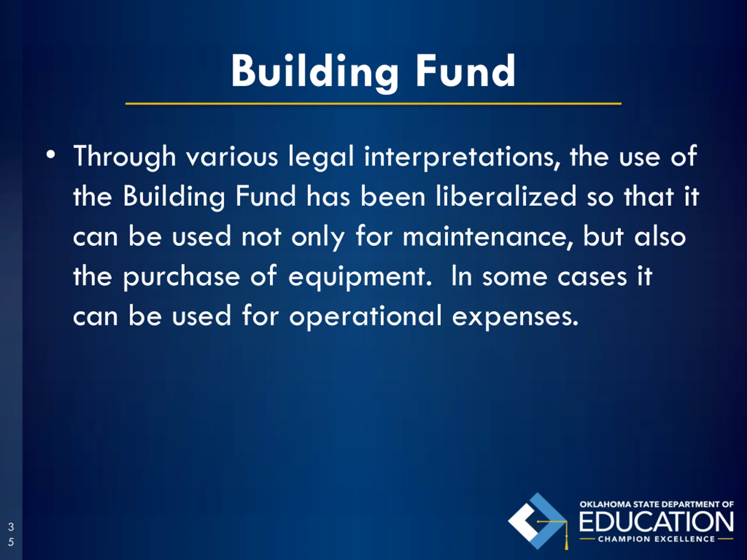 Building Fund Through various legal interpretations, the use of the Building Fund has been liberalized so that it can be used not only for maintenance, but also the purchase of equipment. In some cases it can be used for operational expenses. 3 5