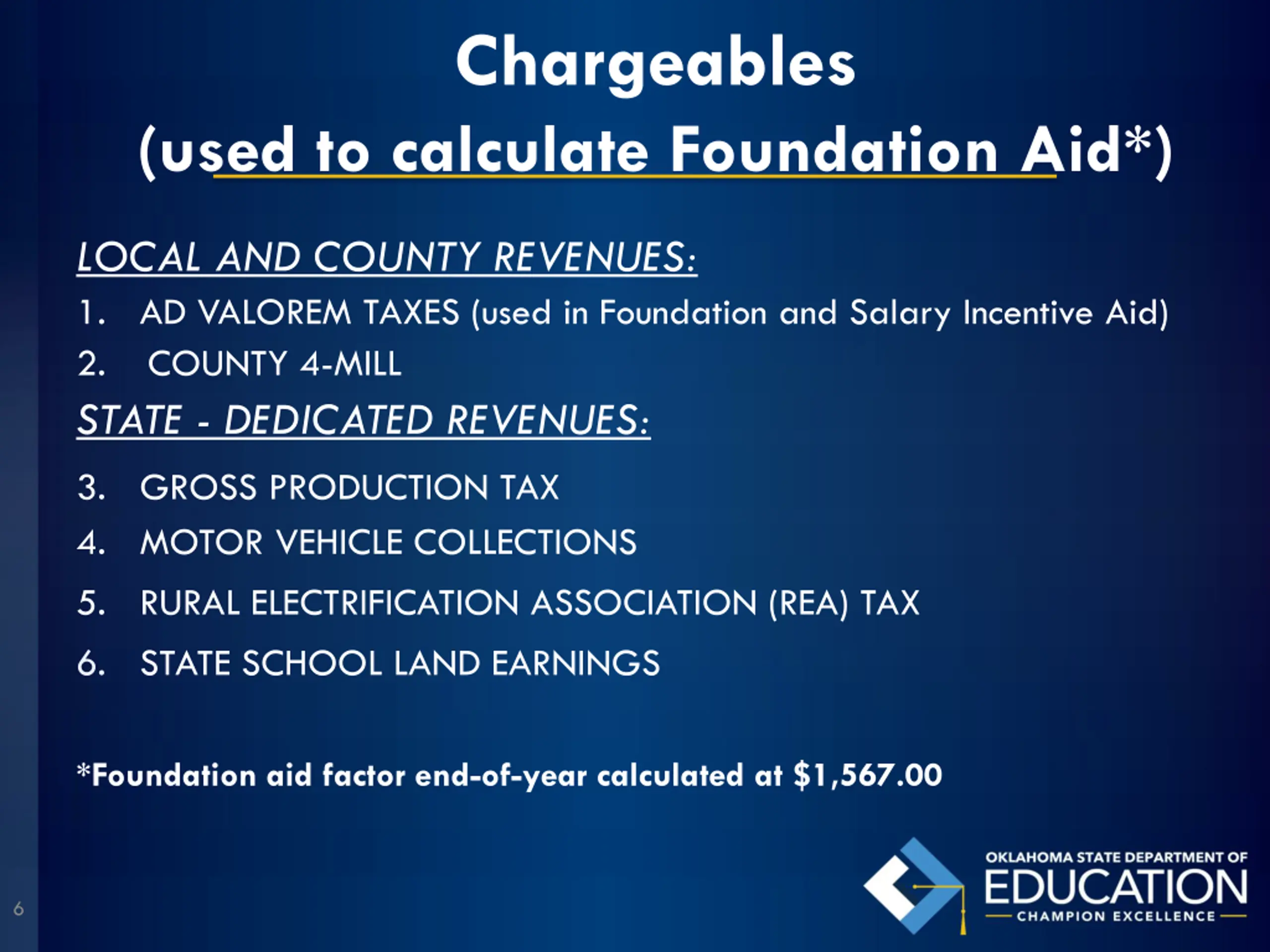 Chargeables (used to calculate Foundation Aid*) LOCAL AND COUNTY REVENUES: 1. AD VALOREM TAXES (used in Foundation and Salary Incentive Aid) 2. COUNTY 4-MILL STATE - DEDICATED REVENUES: 3. GROSS PRODUCTION TAX 4. MOTOR VEHICLE COLLECTIONS 5. RURAL ELECTRIFICATION ASSOCIATION (REA) TAX 6. STATE SCHOOL LAND EARNINGS *Foundation aid factor end-of-year calculated at $1,567.00 6