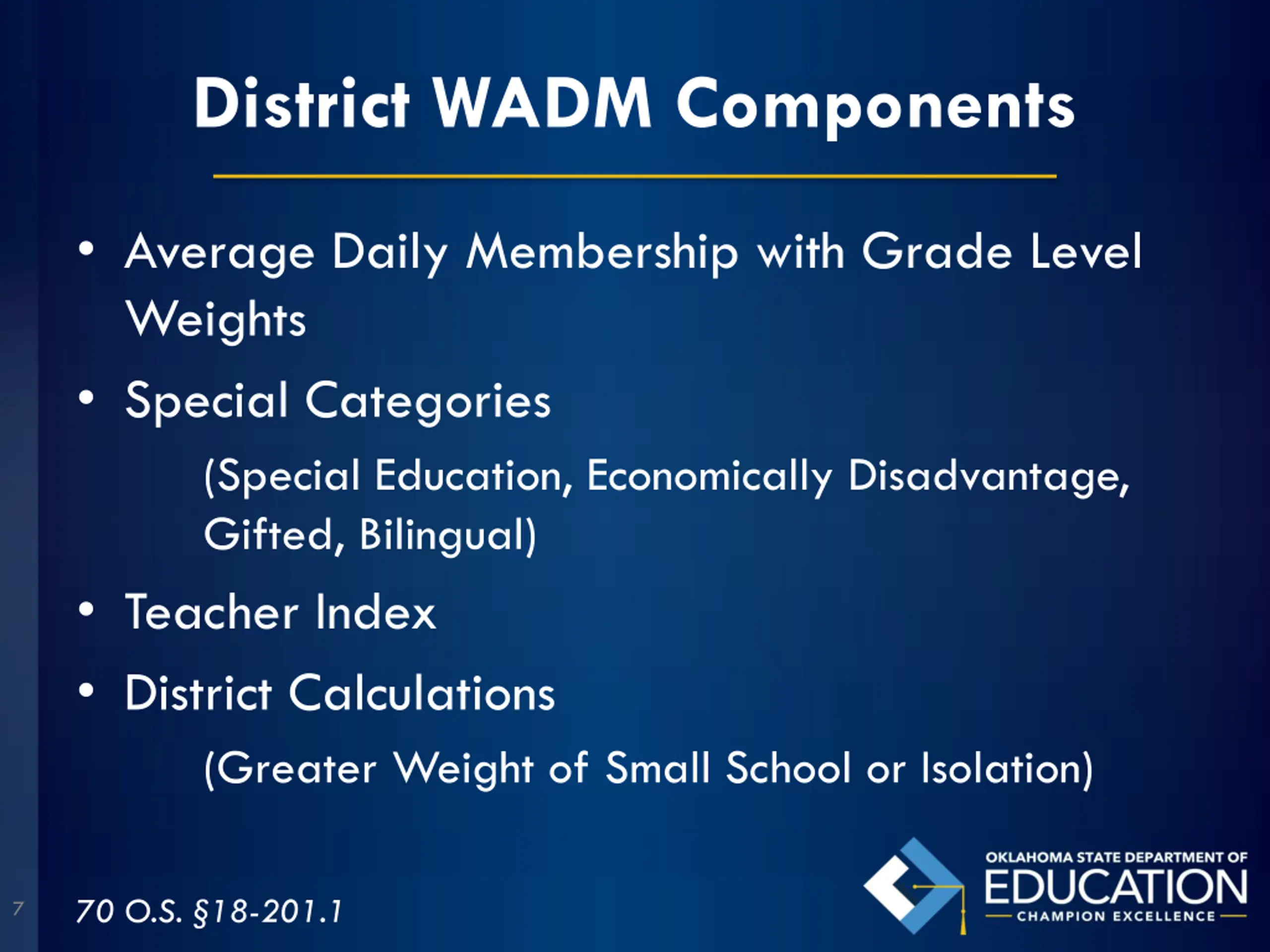District WADM Components Average Daily Membership with Grade Level Weights Special Categories (Special Education, Economically Disadvantage, Gifted, Bilingual) Teacher Index District Calculations (Greater Weight of Small School or Isolation) 70 O.S. 18-201.1 7