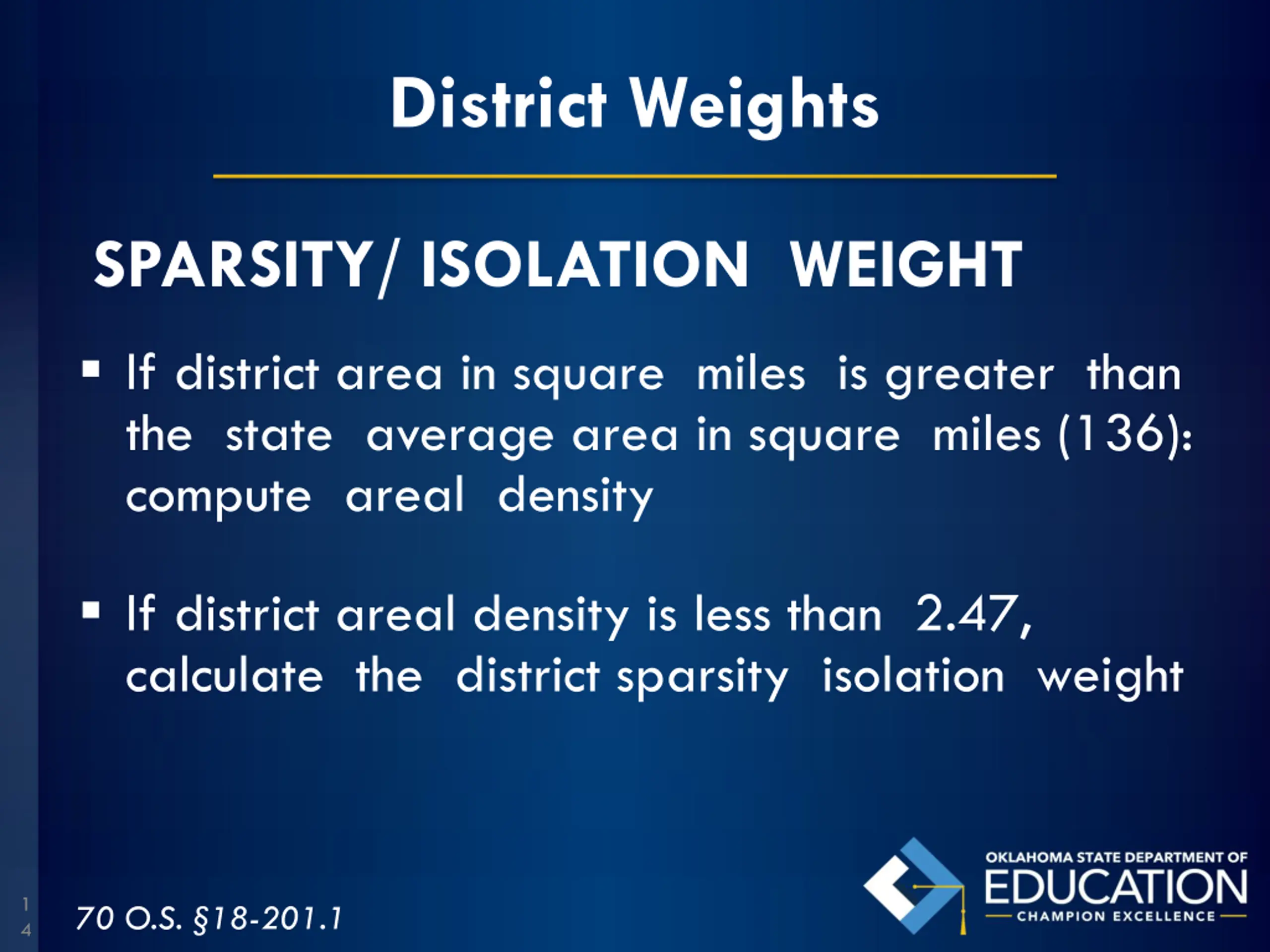 District Weights SPARSITY/ ISOLATION WEIGHT If district area in square miles is greater than the state average area in square miles (136): compute areal density If district areal density is less than 2.47, calculate the district sparsity isolation weight 1 4 70 O.S. 18-201.1
