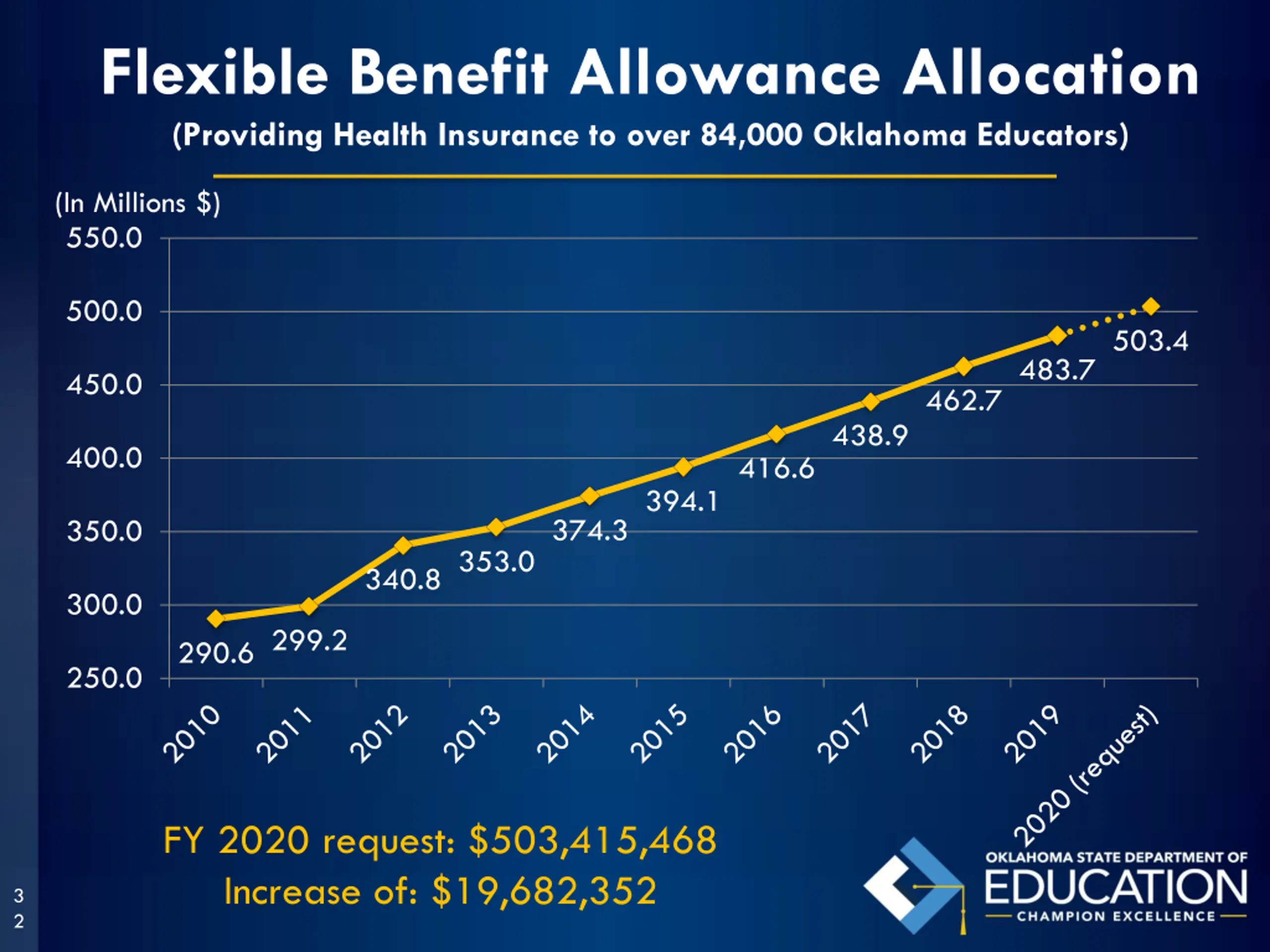 Flexible Benefit Allowance Allocation (Providing Health Insurance to over 84,000 Oklahoma Educators) (In Millions $) 550.0 500.0 503.4 483.7 450.0 462.7 438.9 400.0 416.6 394.1 374.3 350.0 340.8353.0 300.0 290.6299.2 250.0 FY 2020 request: $503,415,468 Increase of: $19,682,352 3 2