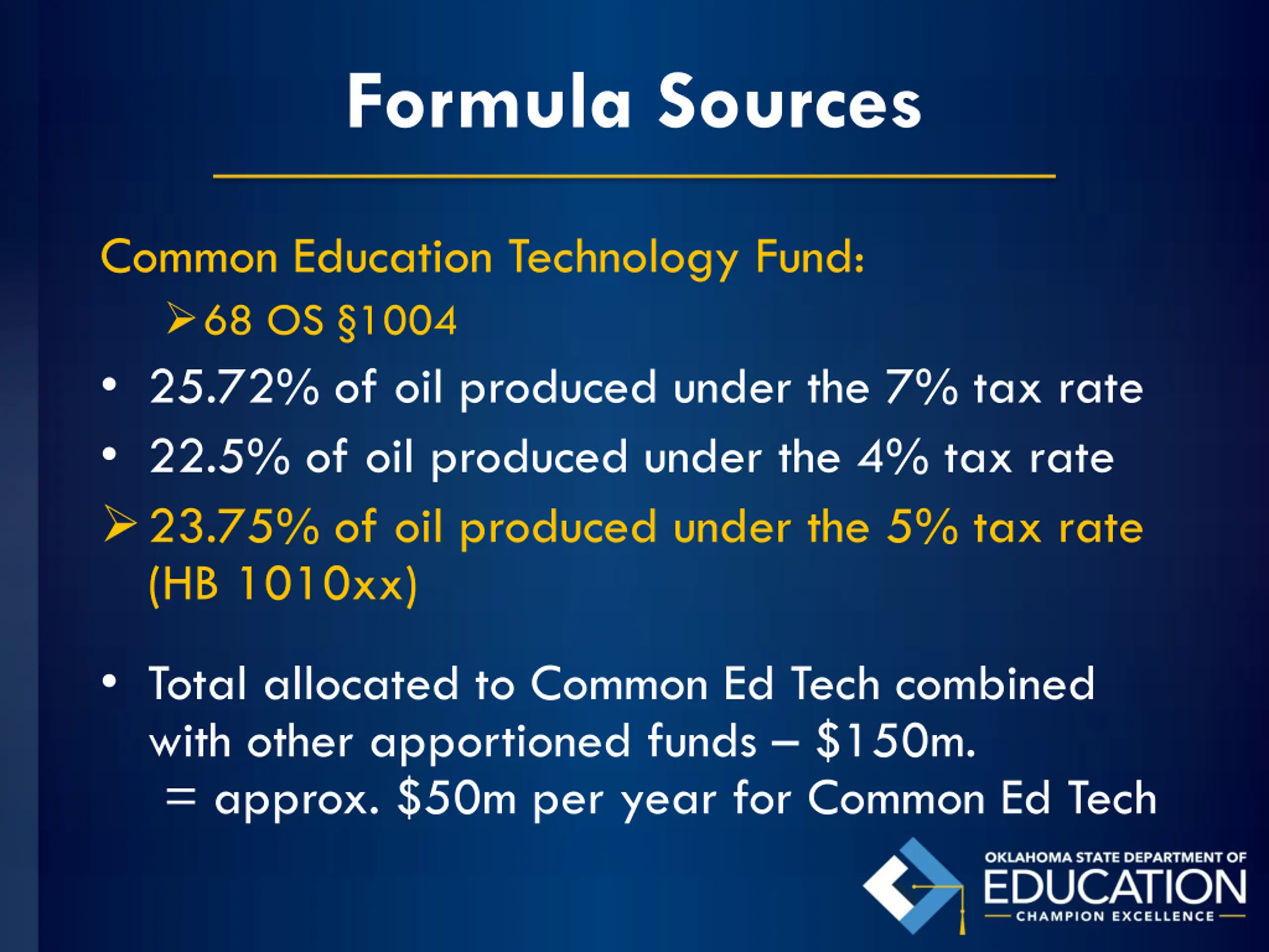 Formula Sources Common Education Technology Fund: 68 OS 1004 25.72% of oil produced under the 7% tax rate 22.5% of oil produced under the 4% tax rate 23.75% of oil produced under the 5% tax rate (HB 1010xx) Total allocated to Common Ed Tech combined with other apportioned funds $150m. = approx. $50m per year for Common Ed Tech