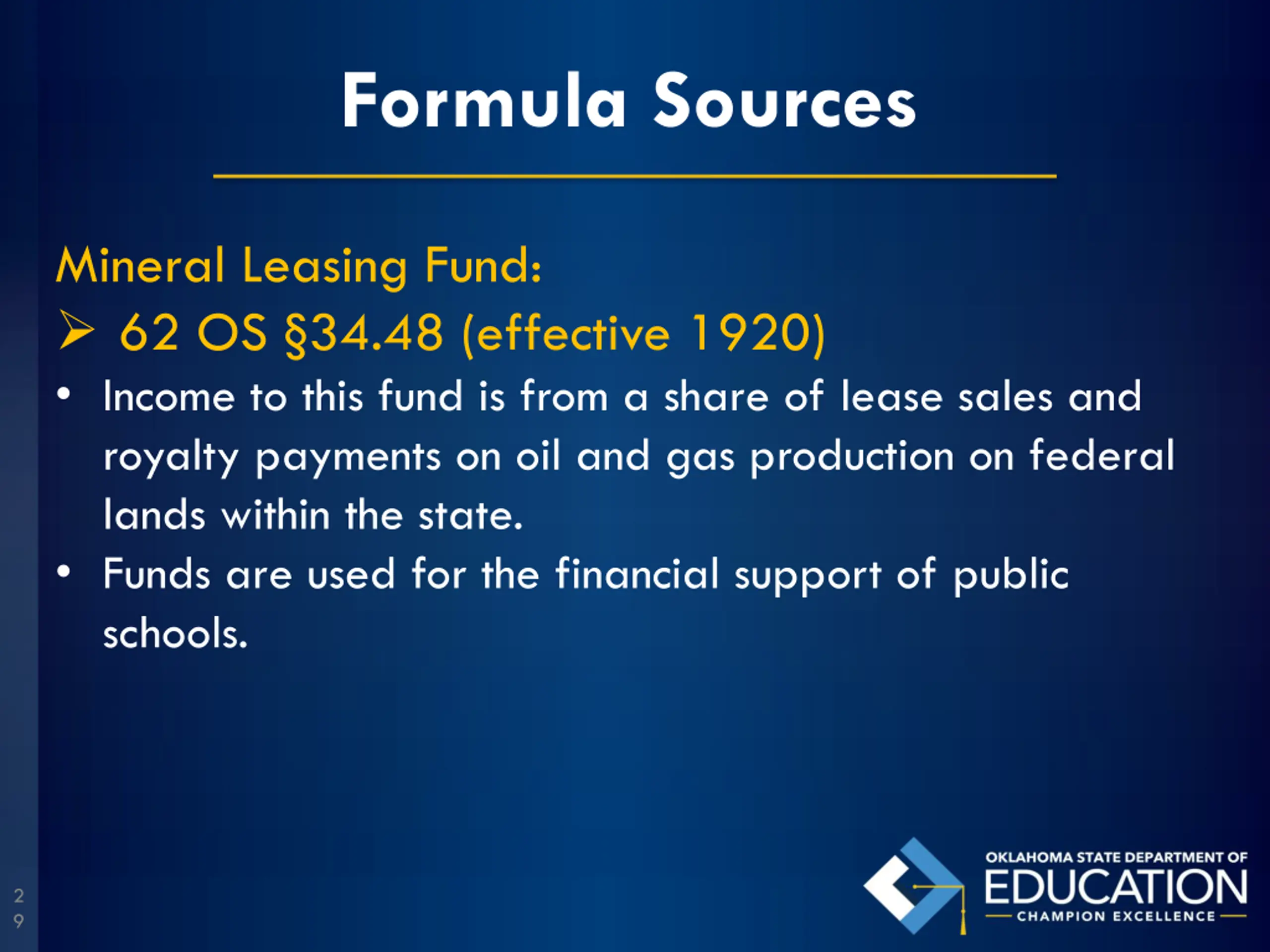 Formula Sources Mineral Leasing Fund: 62 OS 34.48 (effective 1920) Income to this fund is from a share of lease sales and royalty payments on oil and gas production on federal lands within the state. Funds are used for the financial support of public schools. 2 9