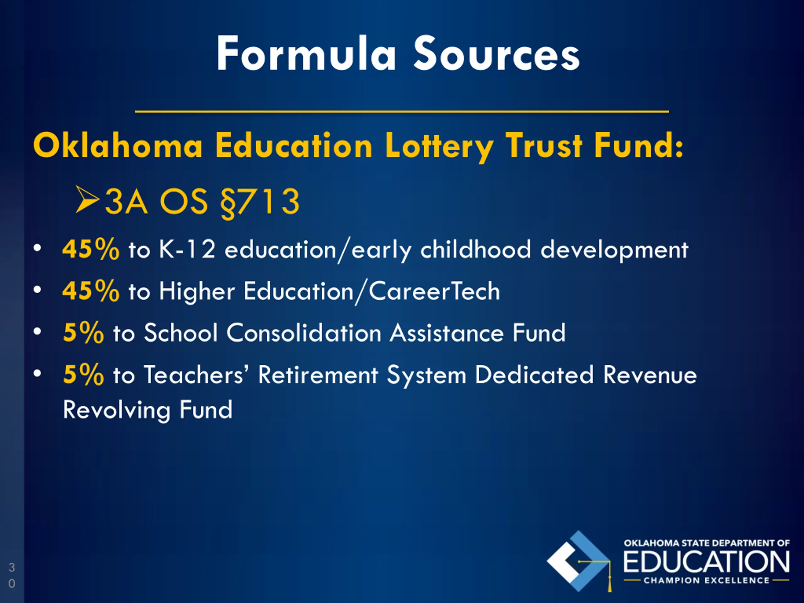 Formula Sources Oklahoma Education Lottery Trust Fund: 3A OS 713 45% to K-12 education/early childhood development 45% to Higher Education/CareerTech 5% to School Consolidation Assistance Fund 5% to Teachers Retirement System Dedicated Revenue Revolving Fund 3 0