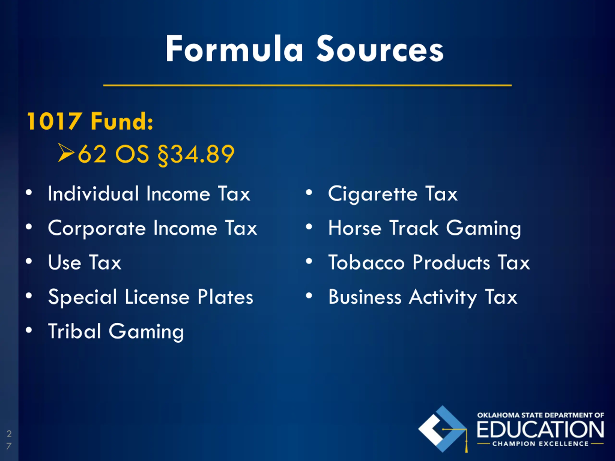 Formula Sources 1017 Fund: 62 OS 34.89 Individual Income Tax Corporate Income Tax Use Tax Special License Plates Tribal Gaming Cigarette Tax Horse Track Gaming Tobacco Products Tax Business Activity Tax 2 7