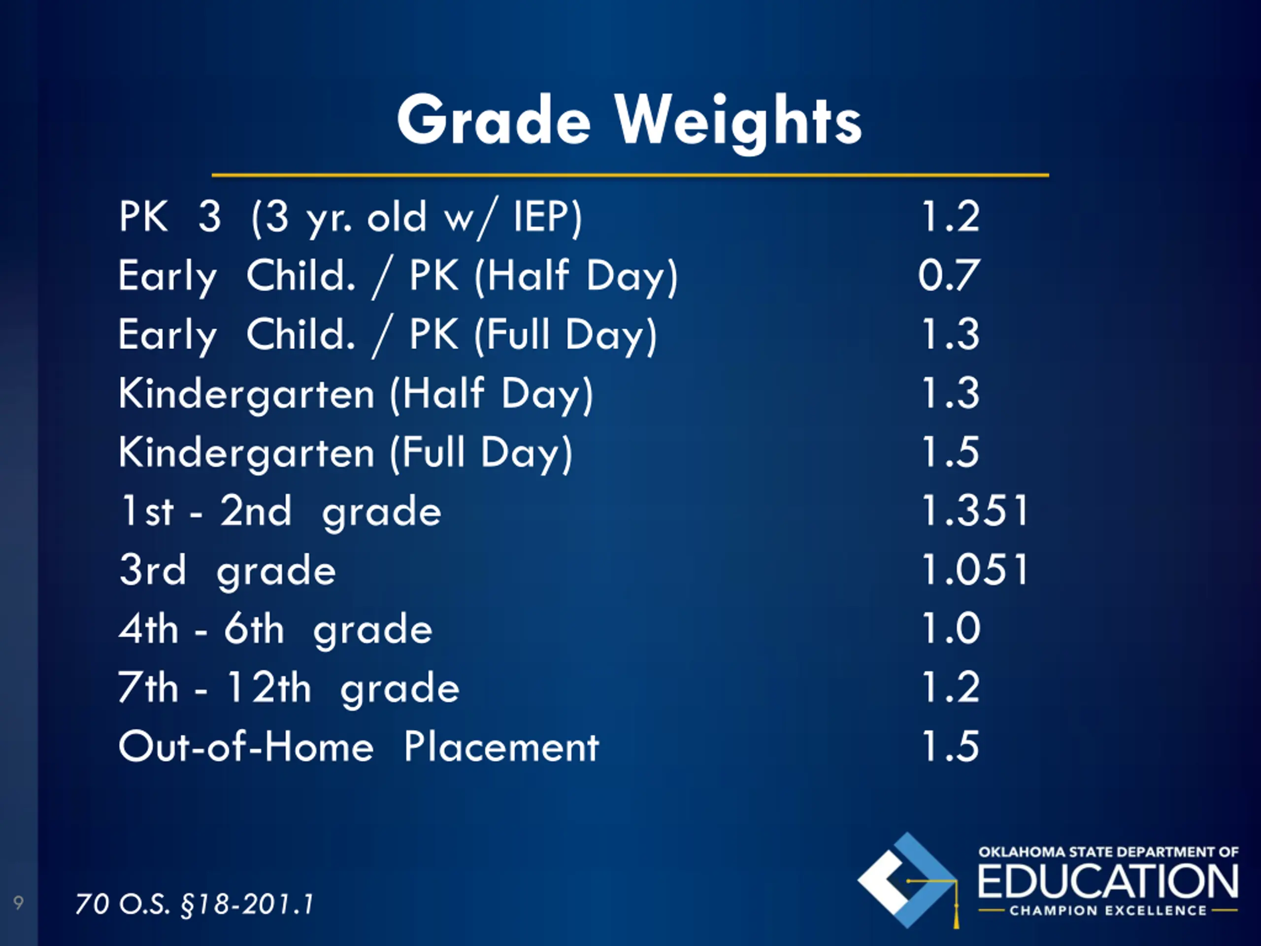Grade Weights PK 3 (3 yr. old w/ IEP) Early Child. / PK (Half Day) Early Child. / PK (Full Day) Kindergarten (Half Day) Kindergarten (Full Day) 1st - 2nd grade 3rd grade 4th - 6th grade 7th - 12th grade Out-of-Home Placement 1.2 0.7 1.3 1.3 1.5 1.351 1.051 1.0 1.2 1.5 70 O.S. 18-201.1 9