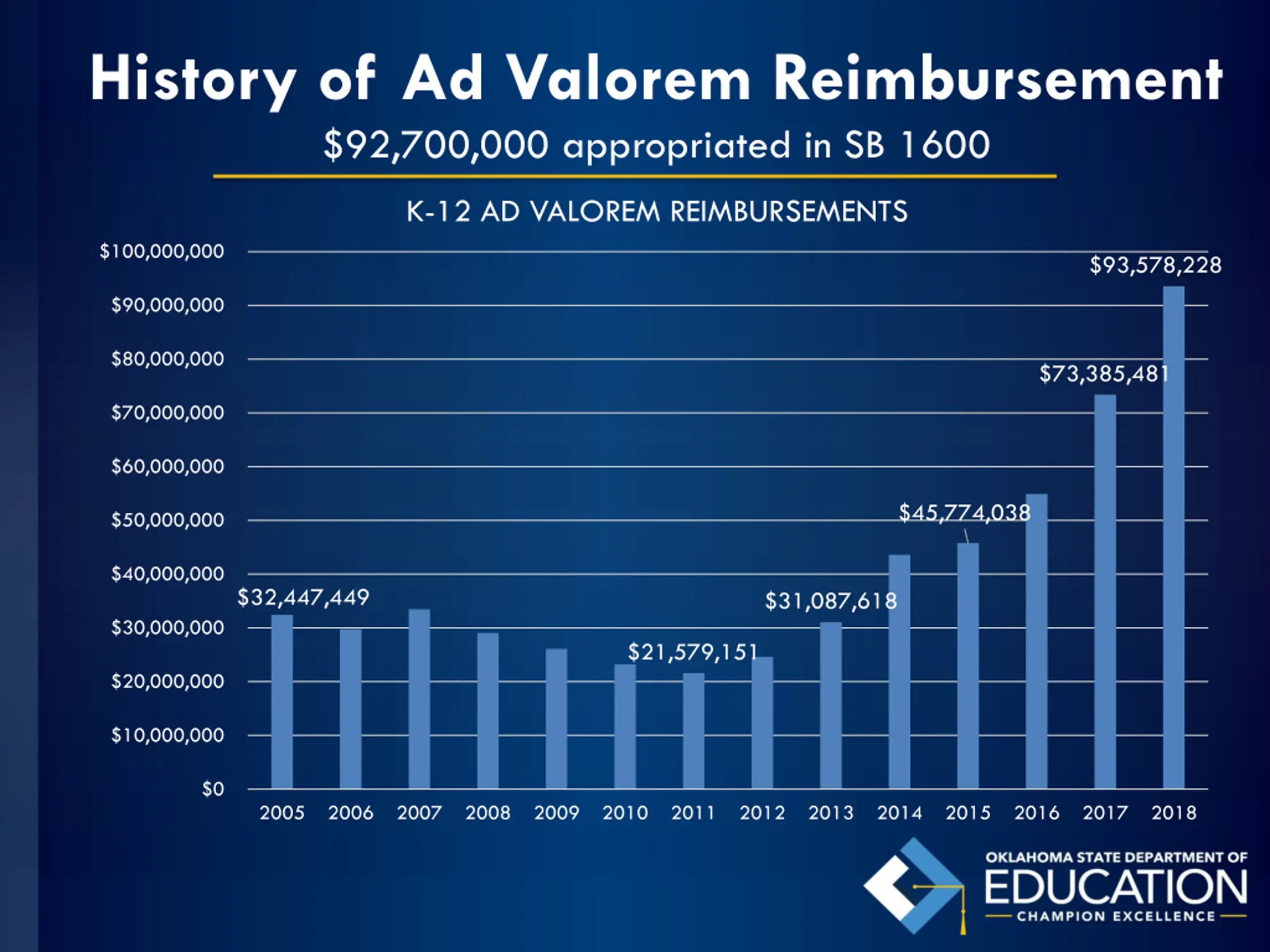History of Ad Valorem Reimbursement $92,700,000 appropriated in SB 1600 K-12 AD VALOREM REIMBURSEMENTS $100,000,000 $93,578,228 $90,000,000 $80,000,000 $73,385,481 $70,000,000 $60,000,000 $45,774,038 $50,000,000 $40,000,000 $32,447,449 $31,087,618 $30,000,000 $21,579,151 $20,000,000 $10,000,000 $0 2005 2006 2007 2008 2009 2010 2011 2012 2013 2014 2015 2016 2017 2018