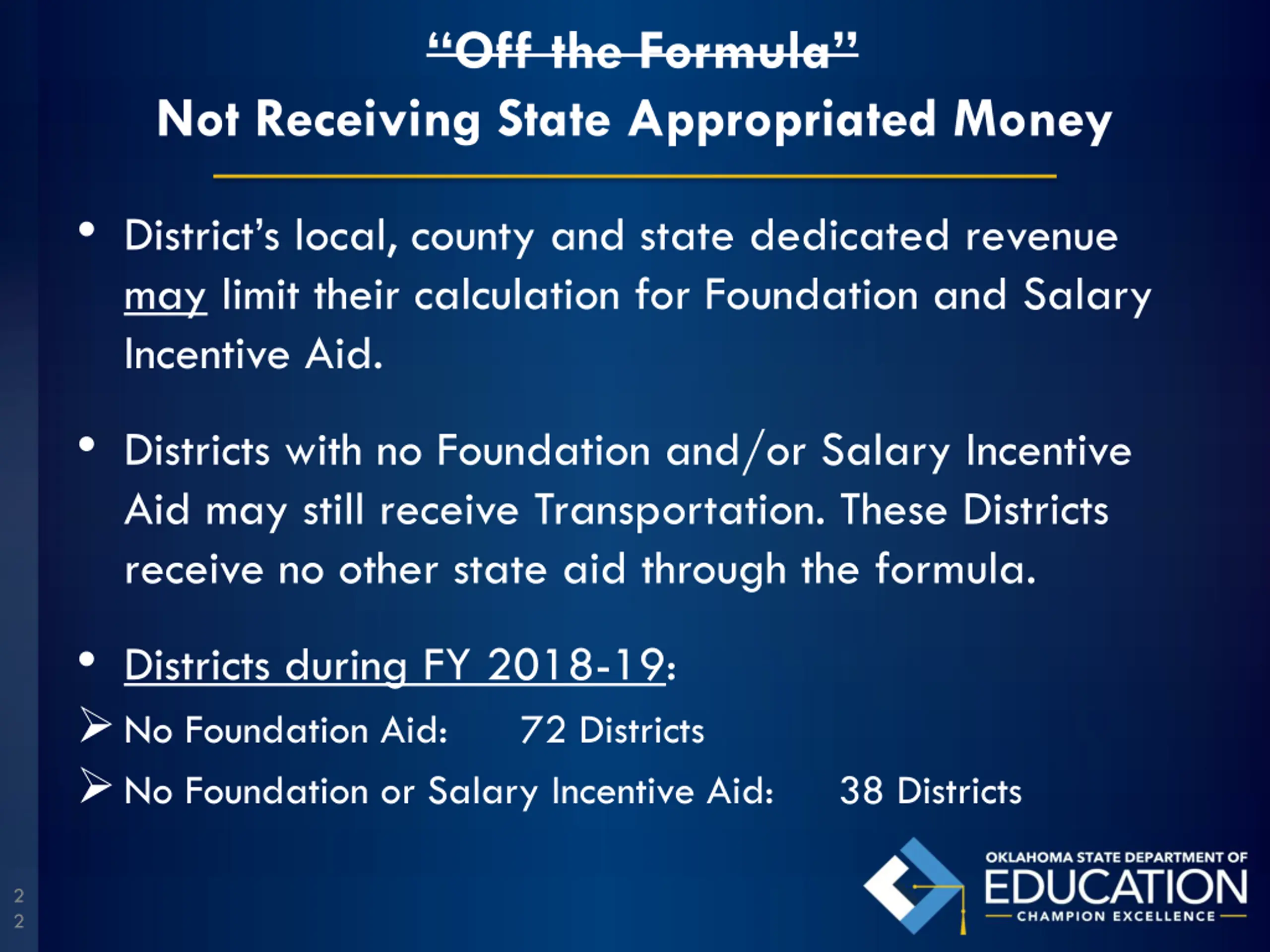 Districts Off the Formula Not Receiving State Appropriated Money All Districts are ON THE FORMULA . Revenue typically considered as local wealth may prevent a district from receiving State appropriated money. 2 1
