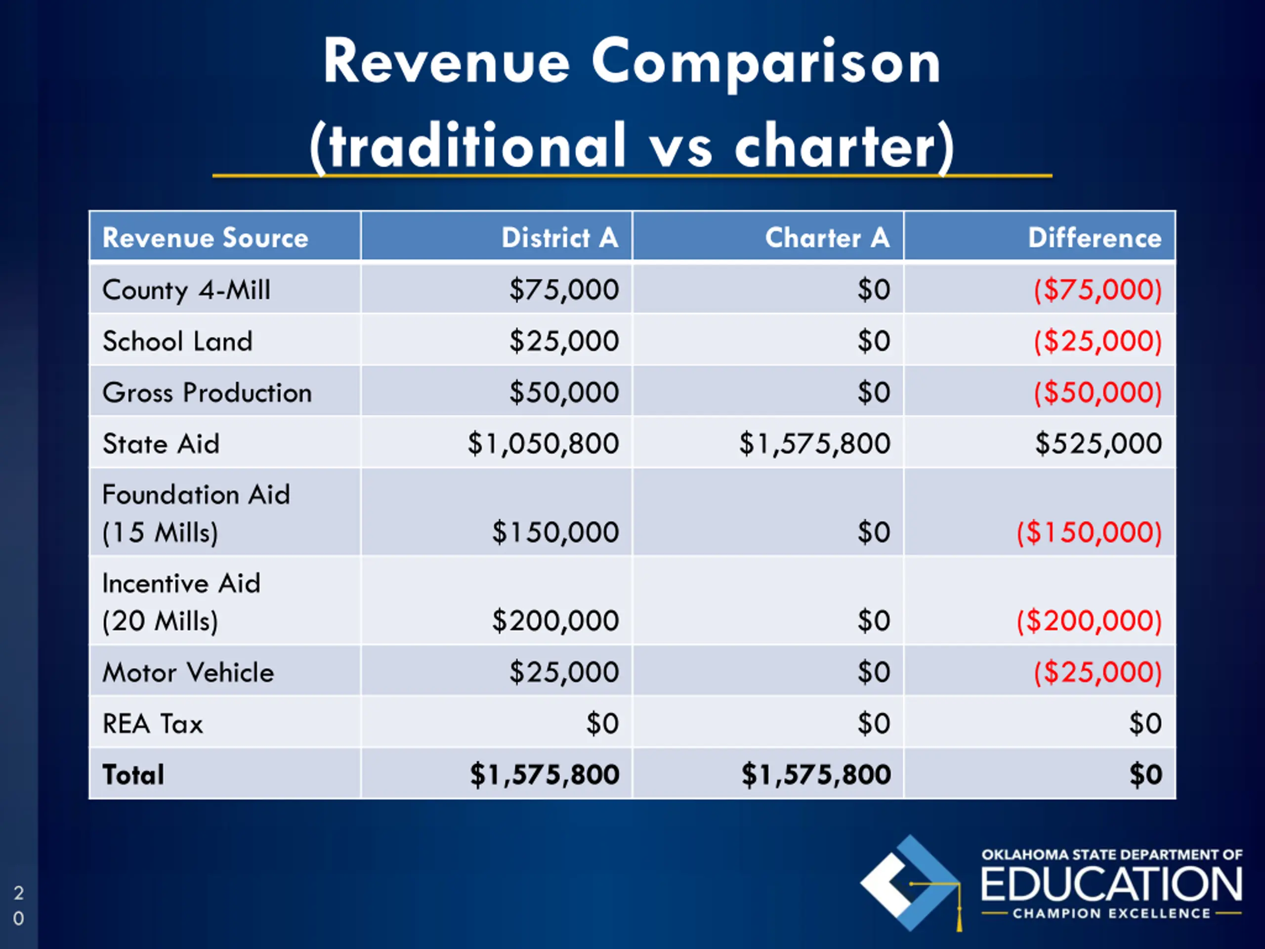 Revenue Comparison (traditional vs charter) Revenue Source District A Charter A Difference County 4-Mill $75,000 $0 ($75,000) School Land $25,000 $0 ($25,000) Gross Production $50,000 $0 ($50,000) State Aid $1,050,800 $1,575,800 $525,000 Foundation Aid (15 Mills) $150,000 $0 ($150,000) Incentive Aid (20 Mills) $200,000 $0 ($200,000) Motor Vehicle $25,000 $0 ($25,000) REA Tax $0 $0 $0 Total $1,575,800 $1,575,800 $0 2 0