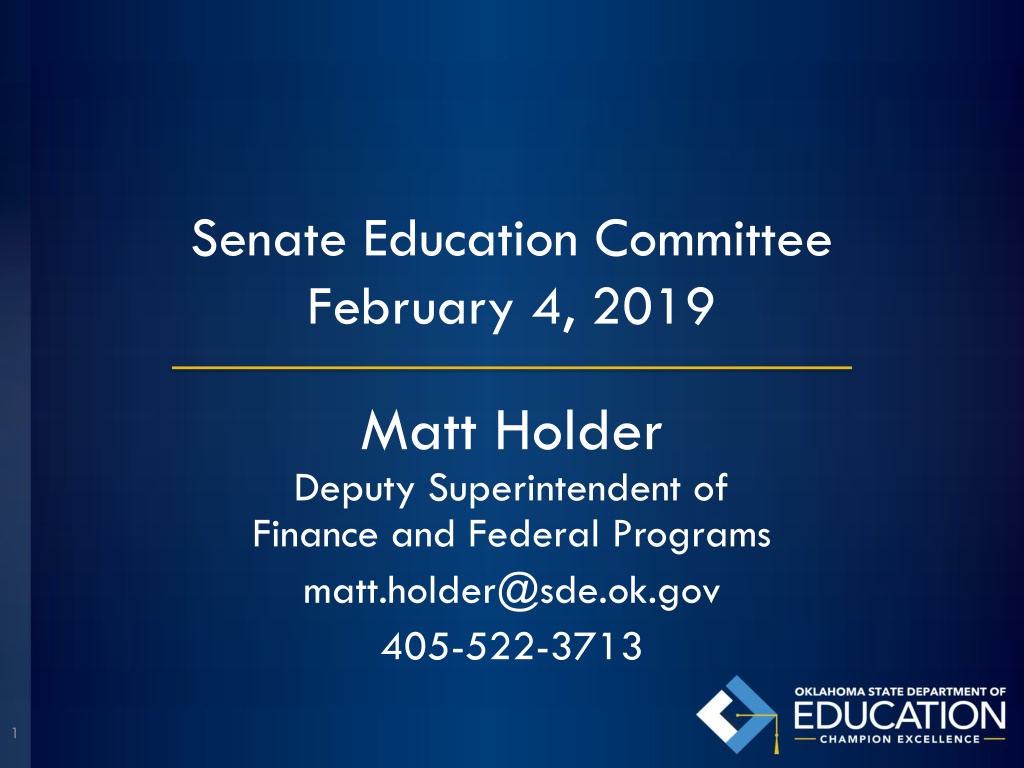 Senate Education Committee February 4, 2019 Matt Holder Deputy Superintendent of Finance and Federal Programs matt.holder@sde.ok.gov 405-522-3713 1
