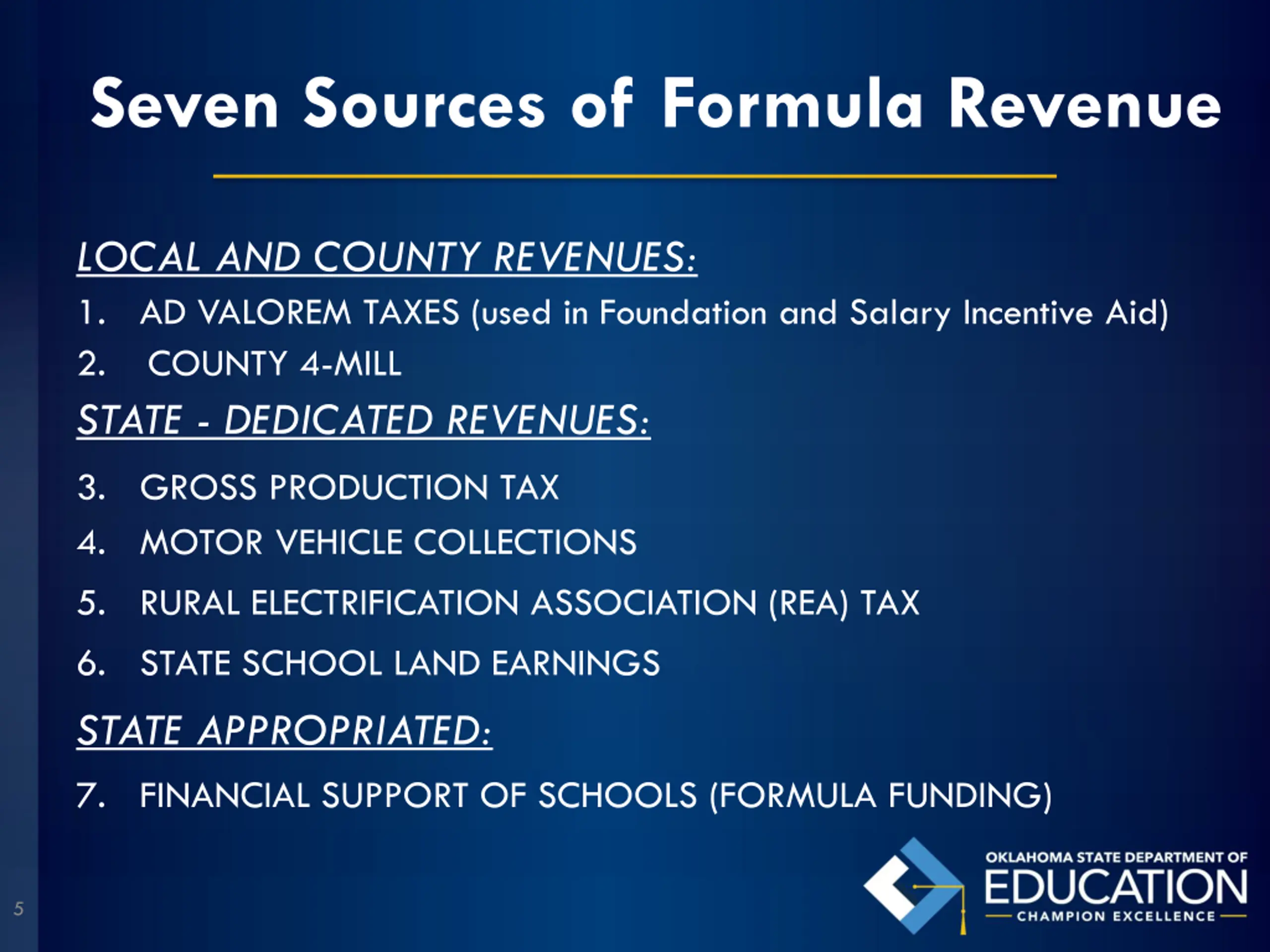 Seven Sources of Formula Revenue LOCAL AND COUNTY REVENUES: 1. AD VALOREM TAXES (used in Foundation and Salary Incentive Aid) 2. COUNTY 4-MILL STATE - DEDICATED REVENUES: 3. GROSS PRODUCTION TAX 4. MOTOR VEHICLE COLLECTIONS 5. RURAL ELECTRIFICATION ASSOCIATION (REA) TAX 6. STATE SCHOOL LAND EARNINGS STATE APPROPRIATED: 7. FINANCIAL SUPPORT OF SCHOOLS (FORMULA FUNDING) 5