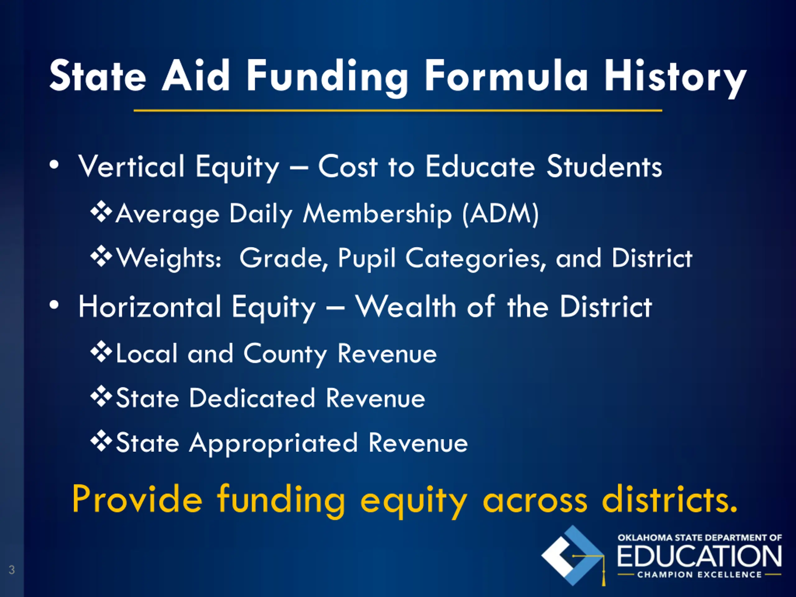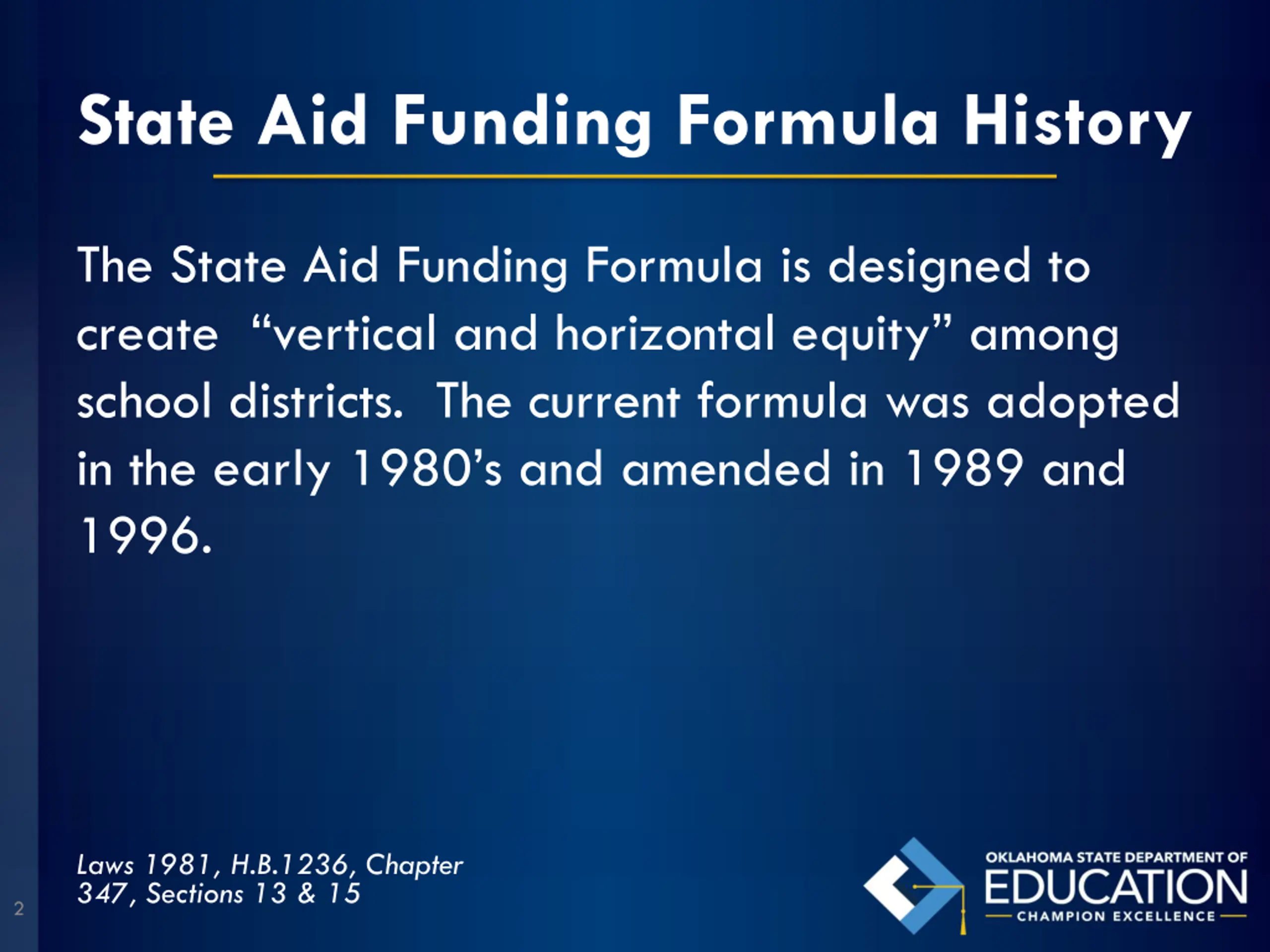State Aid Funding Formula History The State Aid Funding Formula is designed to create vertical and horizontal equity among school districts. The current formula was adopted in the early 1980 s and amended in 1989 and 1996. Laws 1981, H.B.1236, Chapter 347, Sections 13 & 15 2