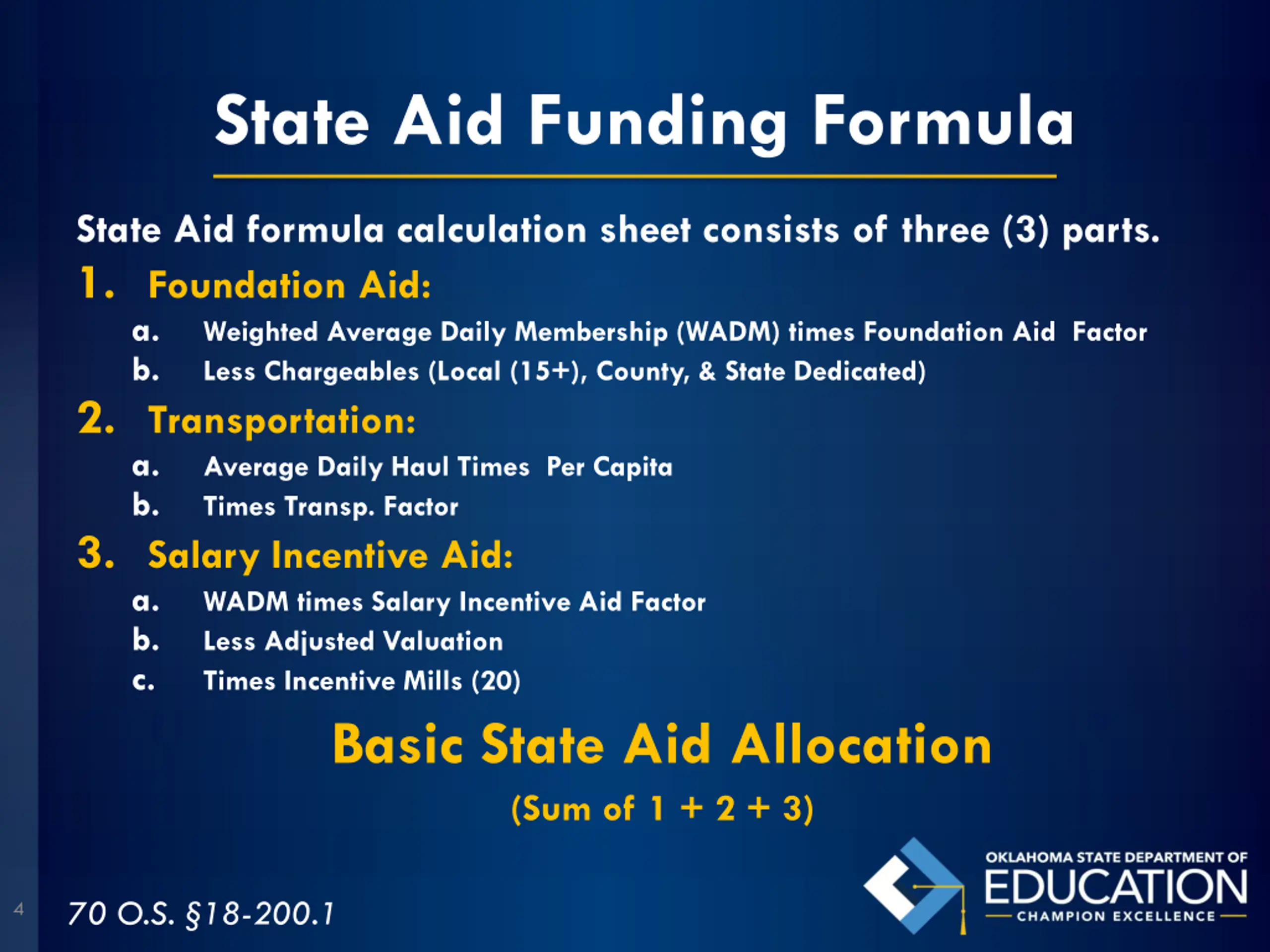State Aid Funding Formula State Aid formula calculation sheet consists of three (3) parts. 1. Foundation Aid: a. Weighted Average Daily Membership (WADM) times Foundation Aid Factor b. Less Chargeables (Local (15+), County, & State Dedicated) 2. Transportation: a. Average Daily Haul Times Per Capita b. Times Transp. Factor 3. Salary Incentive Aid: a. WADM times Salary Incentive Aid Factor b. Less Adjusted Valuation c. Times Incentive Mills (20) Basic State Aid Allocation (Sum of 1 + 2 + 3) 70 O.S. 18-200.1 4