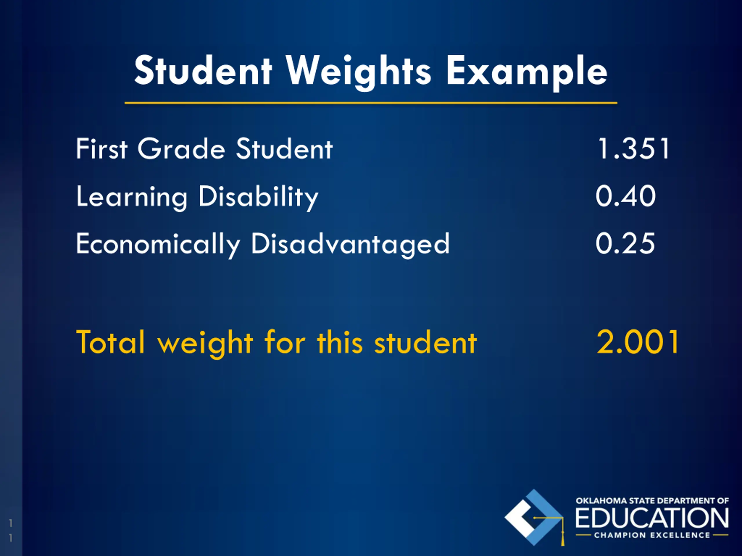 Student Weights Example First Grade Student 1.351 Learning Disability 0.40 Economically Disadvantaged 0.25 Total weight for this student 2.001 1 1