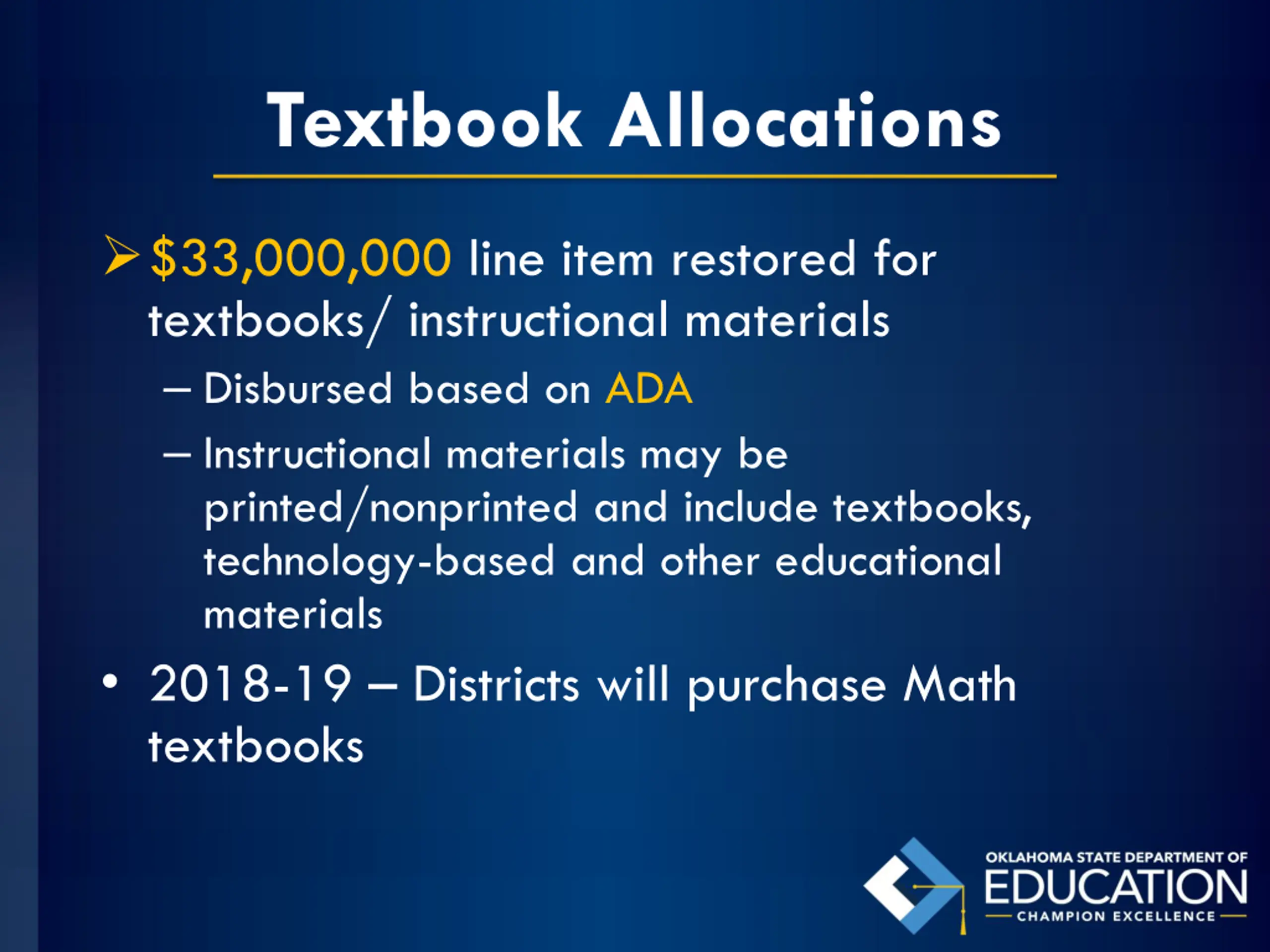 Textbook Allocations $33,000,000 line item restored for textbooks/ instructional materials Disbursed based on ADA Instructional materials may be printed/nonprinted and include textbooks, technology-based and other educational materials 2018-19 Districts will purchase Math textbooks