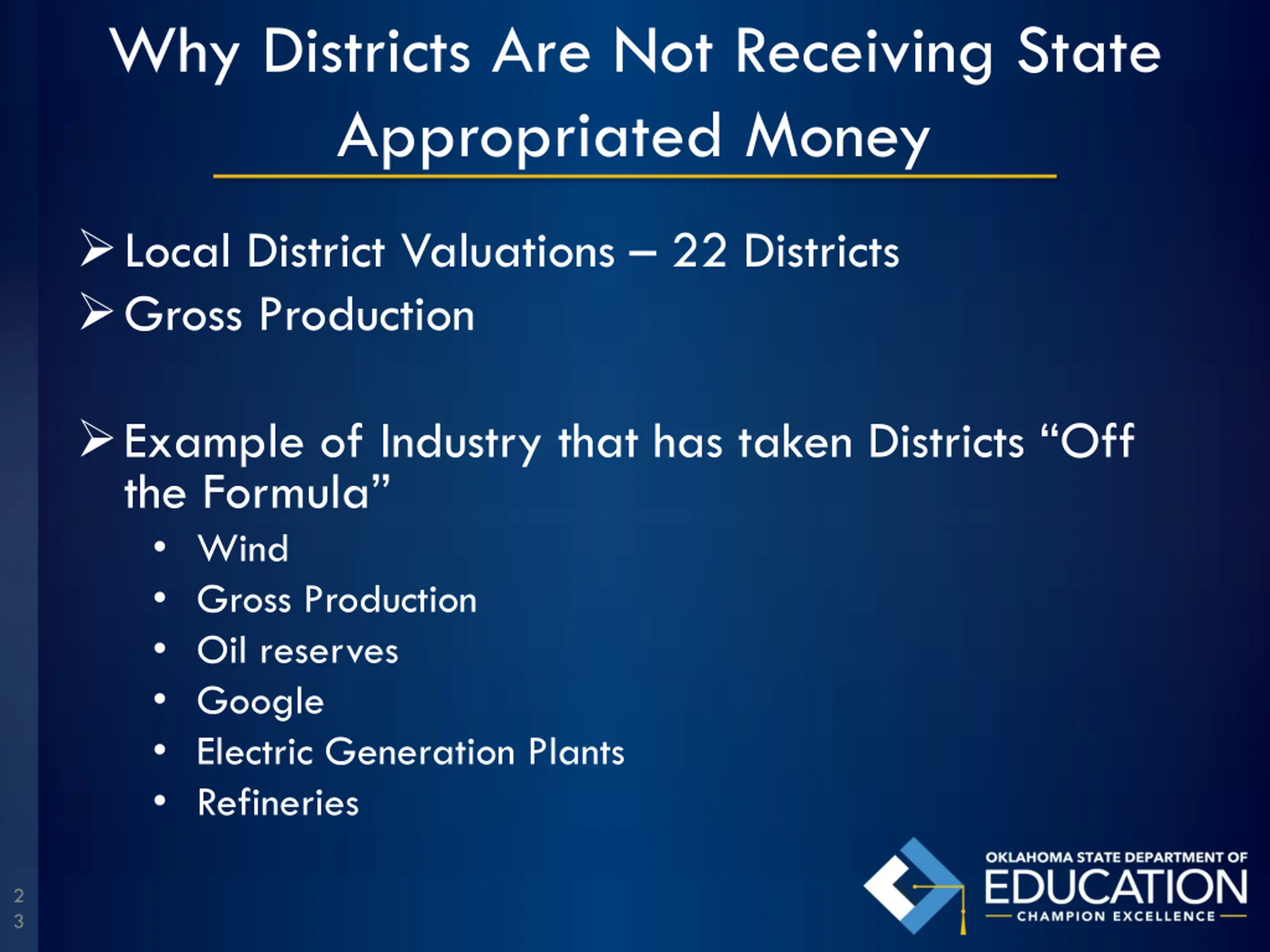 Why Districts Are Not Receiving State Appropriated Money Local District Valuations 22 Districts Gross Production Example of Industry that has taken Districts Off the Formula Wind Gross Production Oil reserves Google Electric Generation Plants Refineries 2 3