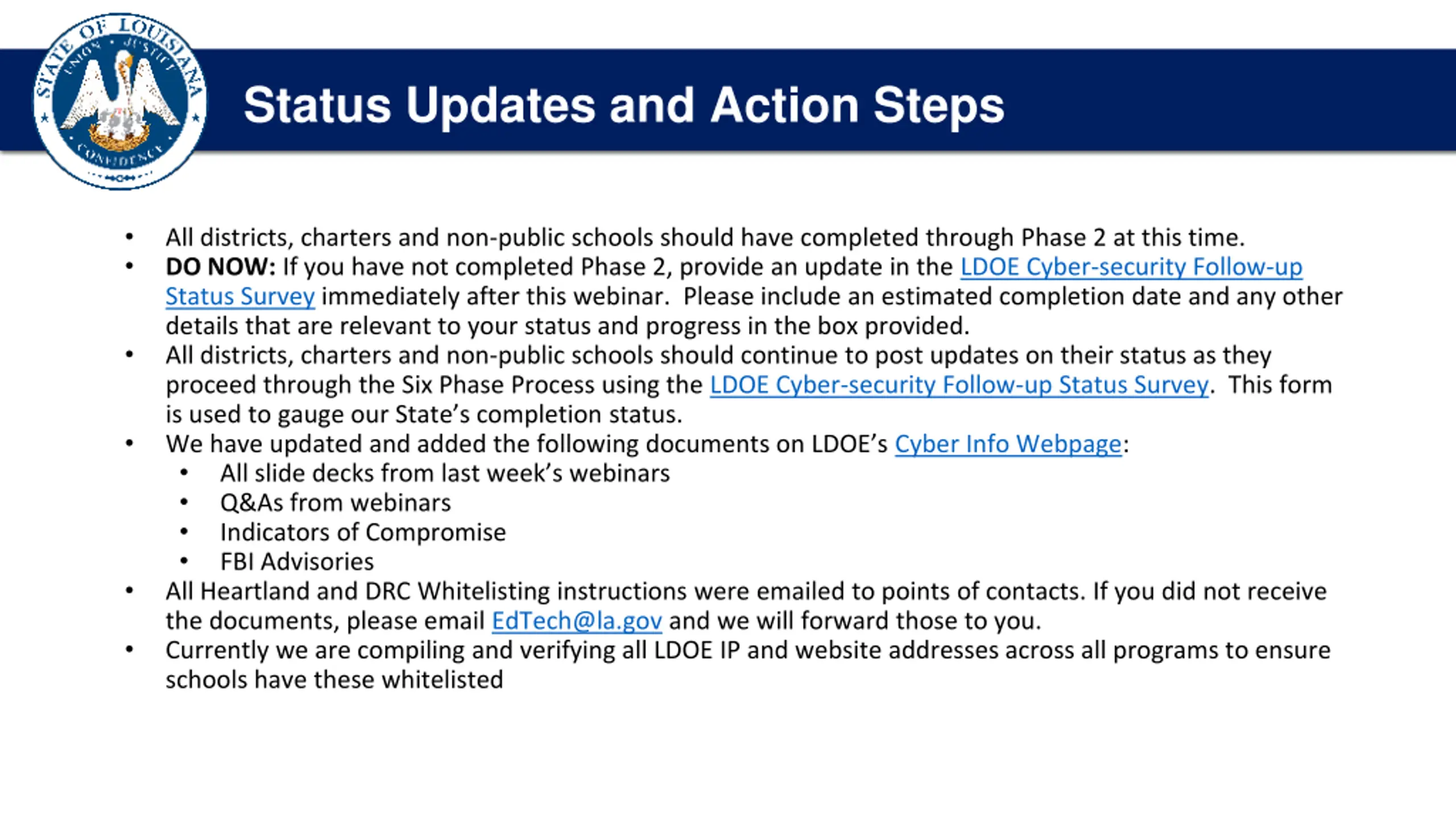 Introduction and Opening Comments Status Updates and Action Steps All districts, charters and non-public schools should have completed through Phase 2 at this time. DO NOW: If you have not completed Phase 2, provide an update in the LDOE Cyber-security Follow-up Status Survey immediately after this webinar. Please include an estimated completion date and any other details that are relevant to your status and progress in the box provided. All districts, charters and non-public schools should continue to post updates on their status as they proceed through the Six Phase Process using the LDOE Cyber-security Follow-up Status Survey. This form is used to gauge our State s completion status. We have updated and added the following documents on LDOE s Cyber Info Webpage: All slide decks from last week s webinars Q&As from webinars Indicators of Compromise FBI Advisories All Heartland and DRC Whitelisting instructions were emailed to points of contacts. If you did not receive the documents, please email EdTech@la.gov and we will forward those to you. Currently we are compiling and verifying all LDOE IP and website addresses across all programs to ensure schools have these whitelisted