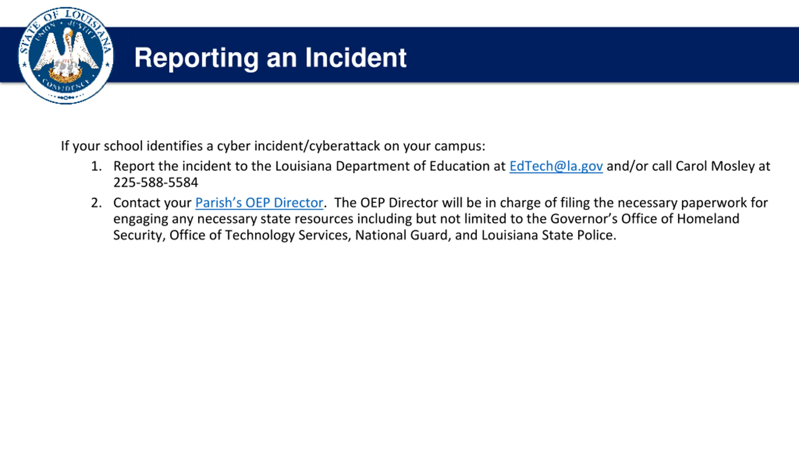 Reporting an Incident If your school identifies a cyber incident/cyberattack on your campus: 1. Report the incident to the Louisiana Department of Education at EdTech@la.gov and/or call Carol Mosley at 225-588-5584 2. Contact your Parish s OEP Director. The OEP Director will be in charge of filing the necessary paperwork for engaging any necessary state resources including but not limited to the Governor s Office of Homeland Security, Office of Technology Services, National Guard, and Louisiana State Police.