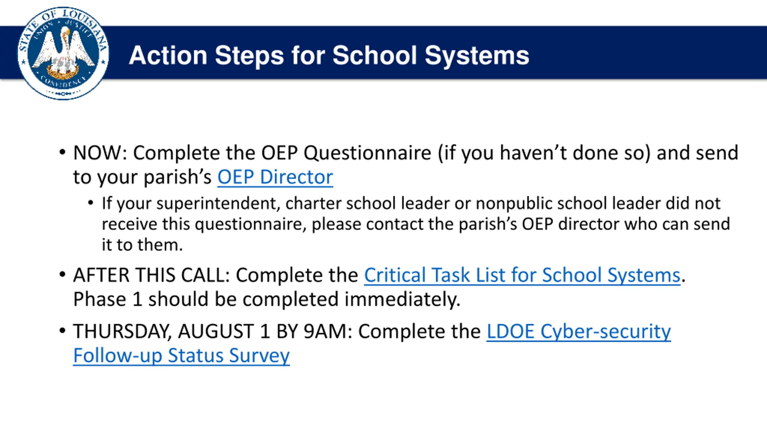 Action Steps for School Systems NOW: Complete the OEP Questionnaire (if you haven t done so) and send to your parish s OEP Director If your superintendent, charter school leader or nonpublic school leader did not receive this questionnaire, please contact the parish s OEP director who can send it to them. AFTER THIS CALL: Complete the Critical Task List for School Systems. Phase 1 should be completed immediately. THURSDAY, AUGUST 1 BY 9AM: Complete the LDOE Cyber-security Follow-up Status Survey