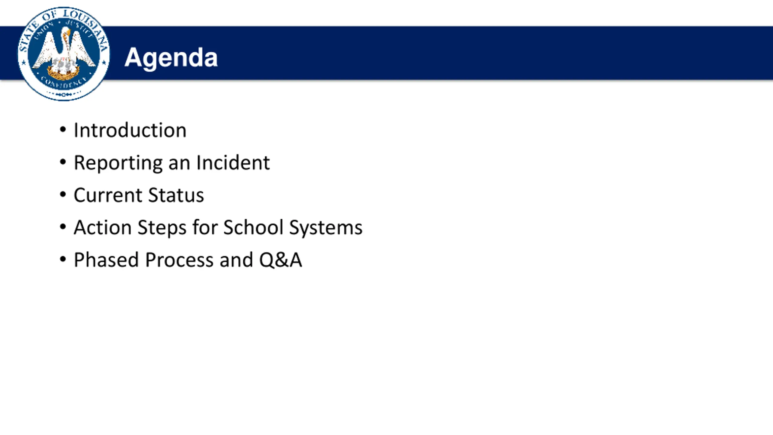 Agenda Introduction Reporting an Incident Current Status Action Steps for School Systems Phased Process and Q&A