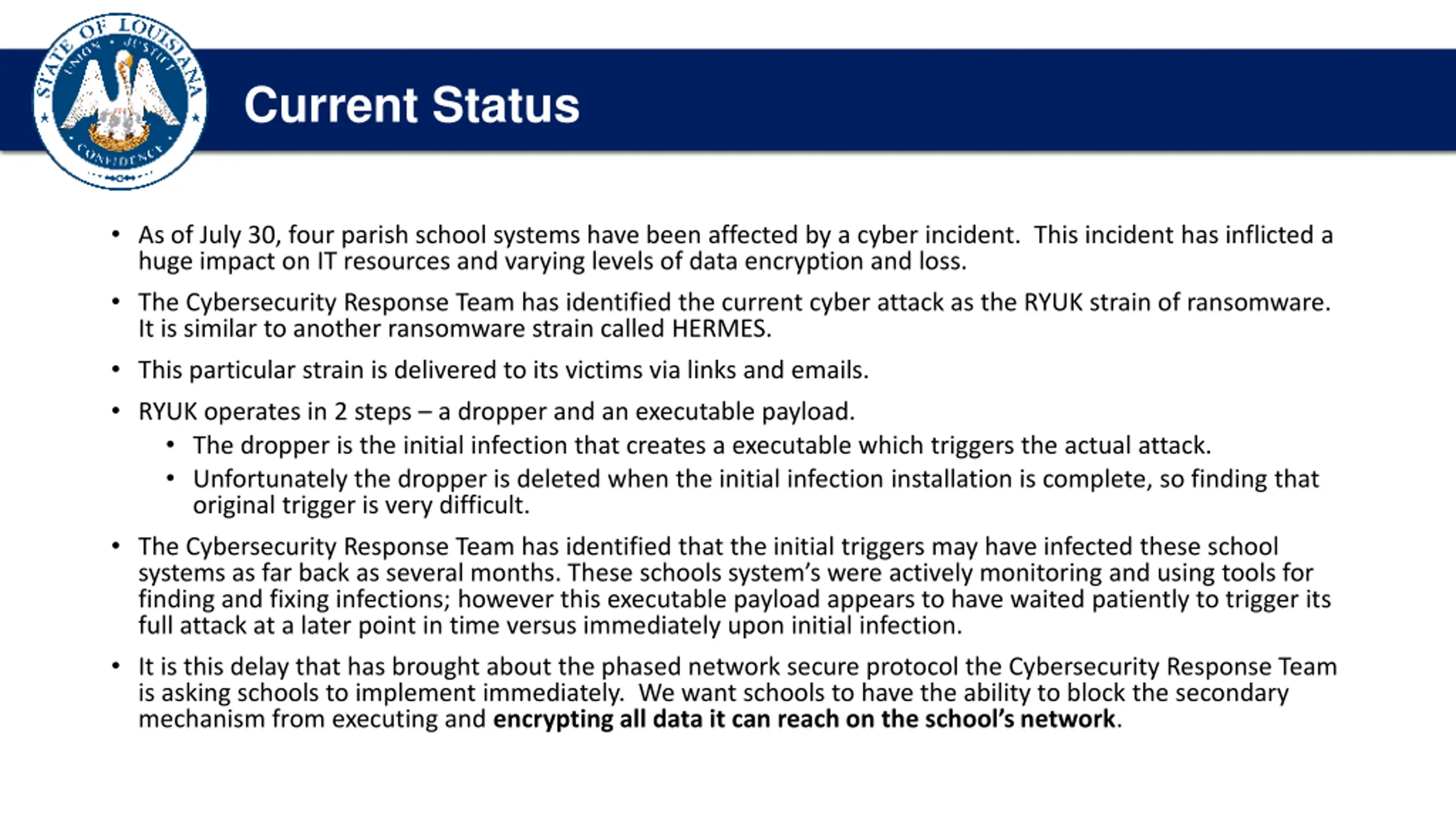 Introduction and Opening Comments Current Status As of July 30, four parish school systems have been affected by a cyber incident. This incident has inflicted a huge impact on IT resources and varying levels of data encryption and loss. The Cybersecurity Response Team has identified the current cyber attack as the RYUK strain of ransomware. It is similar to another ransomware strain called HERMES. This particular strain is delivered to its victims via links and emails. RYUK operates in 2 steps a dropper and an executable payload. The dropper is the initial infection that creates a executable which triggers the actual attack. Unfortunately the dropper is deleted when the initial infection installation is complete, so finding that original trigger is very difficult. The Cybersecurity Response Team has identified that the initial triggers may have infected these school systems as far back as several months. These schools system s were actively monitoring and using tools for finding and fixing infections; however this executable payload appears to have waited patiently to trigger its full attack at a later point in time versus immediately upon initial infection. It is this delay that has brought about the phased network secure protocol the Cybersecurity Response Team is asking schools to implement immediately. We want schools to have the ability to block the secondary mechanism from executing and encrypting all data it can reach on the school s network.