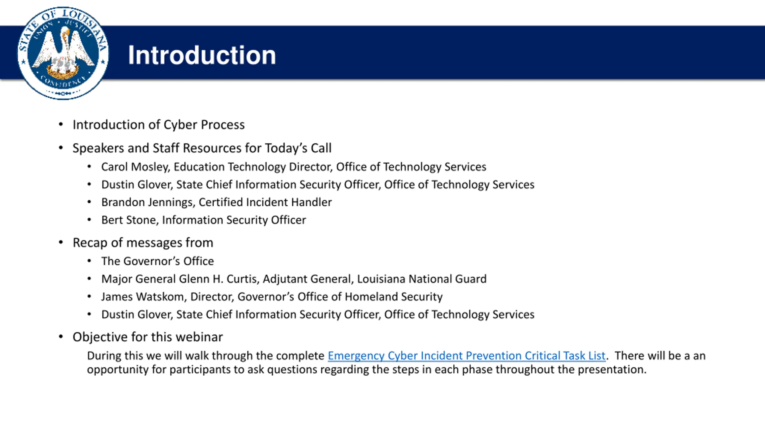 Introduction and Opening Comments Introduction Introduction of Cyber Process Speakers and Staff Resources for Today s Call Carol Mosley, Education Technology Director, Office of Technology Services Dustin Glover, State Chief Information Security Officer, Office of Technology Services Brandon Jennings, Certified Incident Handler Bert Stone, Information Security Officer Recap of messages from The Governor s Office Major General Glenn H. Curtis, Adjutant General, Louisiana National Guard James Watskom, Director, Governor s Office of Homeland Security Dustin Glover, State Chief Information Security Officer, Office of Technology Services Objective for this webinar During this we will walk through the complete Emergency Cyber Incident Prevention Critical Task List. There will be a an opportunity for participants to ask questions regarding the steps in each phase throughout the presentation.