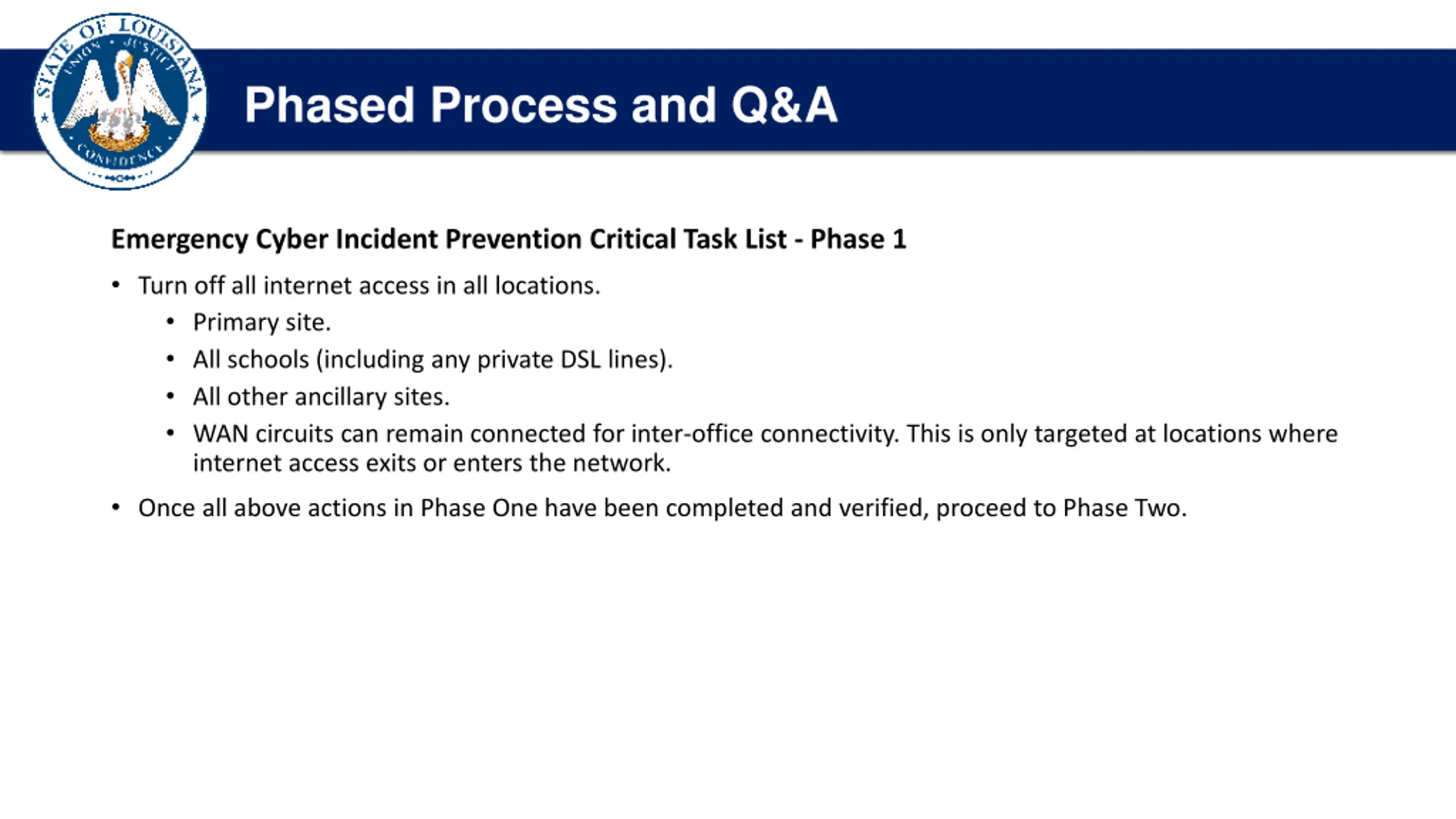 Introduction and Opening Comments Phased Process and Q&A Emergency Cyber Incident Prevention Critical Task List - Phase 1 Turn off all internet access in all locations. Primary site. All schools (including any private DSL lines). All other ancillary sites. WAN circuits can remain connected for inter-office connectivity. This is only targeted at locations where internet access exits or enters the network. Once all above actions in Phase One have been completed and verified, proceed to Phase Two.