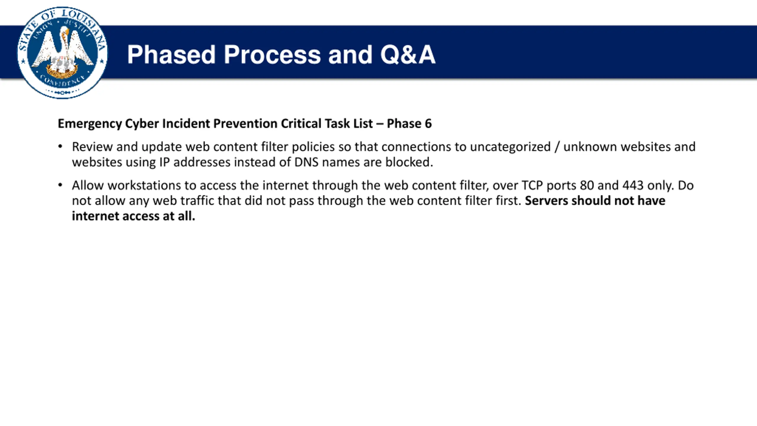 Introduction and Opening Comments Phased Process and Q&A Emergency Cyber Incident Prevention Critical Task List Phase 6 Review and update web content filter policies so that connections to uncategorized / unknown websites and websites using IP addresses instead of DNS names are blocked. Allow workstations to access the internet through the web content filter, over TCP ports 80 and 443 only. Do not allow any web traffic that did not pass through the web content filter first. Servers should not have internet access at all.