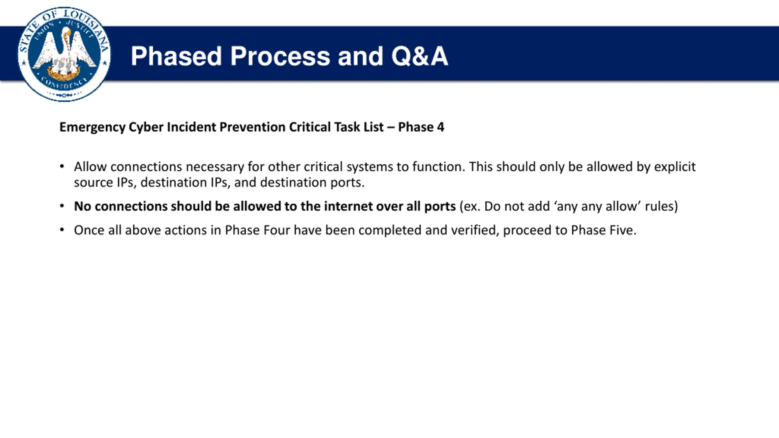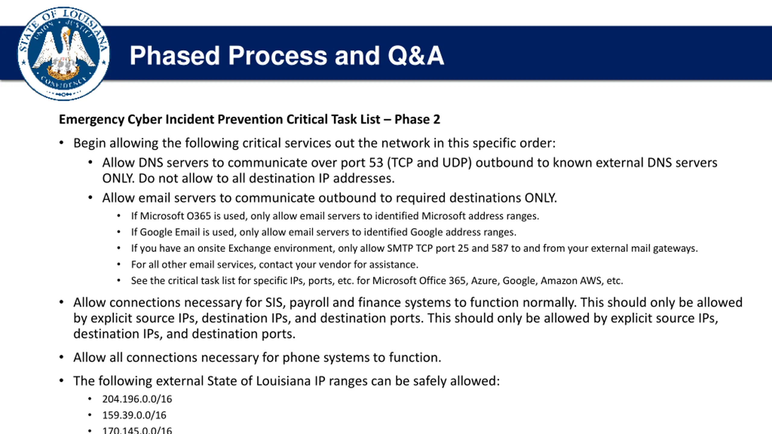 Introduction and Opening Comments Phased Process and Q&A Emergency Cyber Incident Prevention Critical Task List Phase 2 Begin allowing the following critical services out the network in this specific order: Allow DNS servers to communicate over port 53 (TCP and UDP) outbound to known external DNS servers ONLY. Do not allow to all destination IP addresses. Allow email servers to communicate outbound to required destinations ONLY. If Microsoft O365 is used, only allow email servers to identified Microsoft address ranges. If Google Email is used, only allow email servers to identified Google address ranges. If you have an onsite Exchange environment, only allow SMTP TCP port 25 and 587 to and from your external mail gateways. For all other email services, contact your vendor for assistance. See the critical task list for specific IPs, ports, etc. for Microsoft Office 365, Azure, Google, Amazon AWS, etc. Allow connections necessary for SIS, payroll and finance systems to function normally. This should only be allowed by explicit source IPs, destination IPs, and destination ports. This should only be allowed by explicit source IPs, destination IPs, and destination ports. Allow all connections necessary for phone systems to function. The following external State of Louisiana IP ranges can be safely allowed: 204.196.0.0/16 159.39.0.0/16 170.145.0.0/16