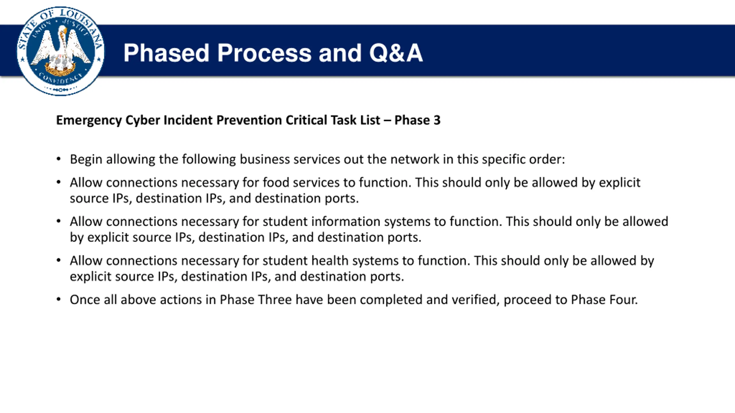Introduction and Opening Comments Phased Process and Q&A Emergency Cyber Incident Prevention Critical Task List Phase 3 Begin allowing the following business services out the network in this specific order: Allow connections necessary for food services to function. This should only be allowed by explicit source IPs, destination IPs, and destination ports. Allow connections necessary for student information systems to function. This should only be allowed by explicit source IPs, destination IPs, and destination ports. Allow connections necessary for student health systems to function. This should only be allowed by explicit source IPs, destination IPs, and destination ports. Once all above actions in Phase Three have been completed and verified, proceed to Phase Four.