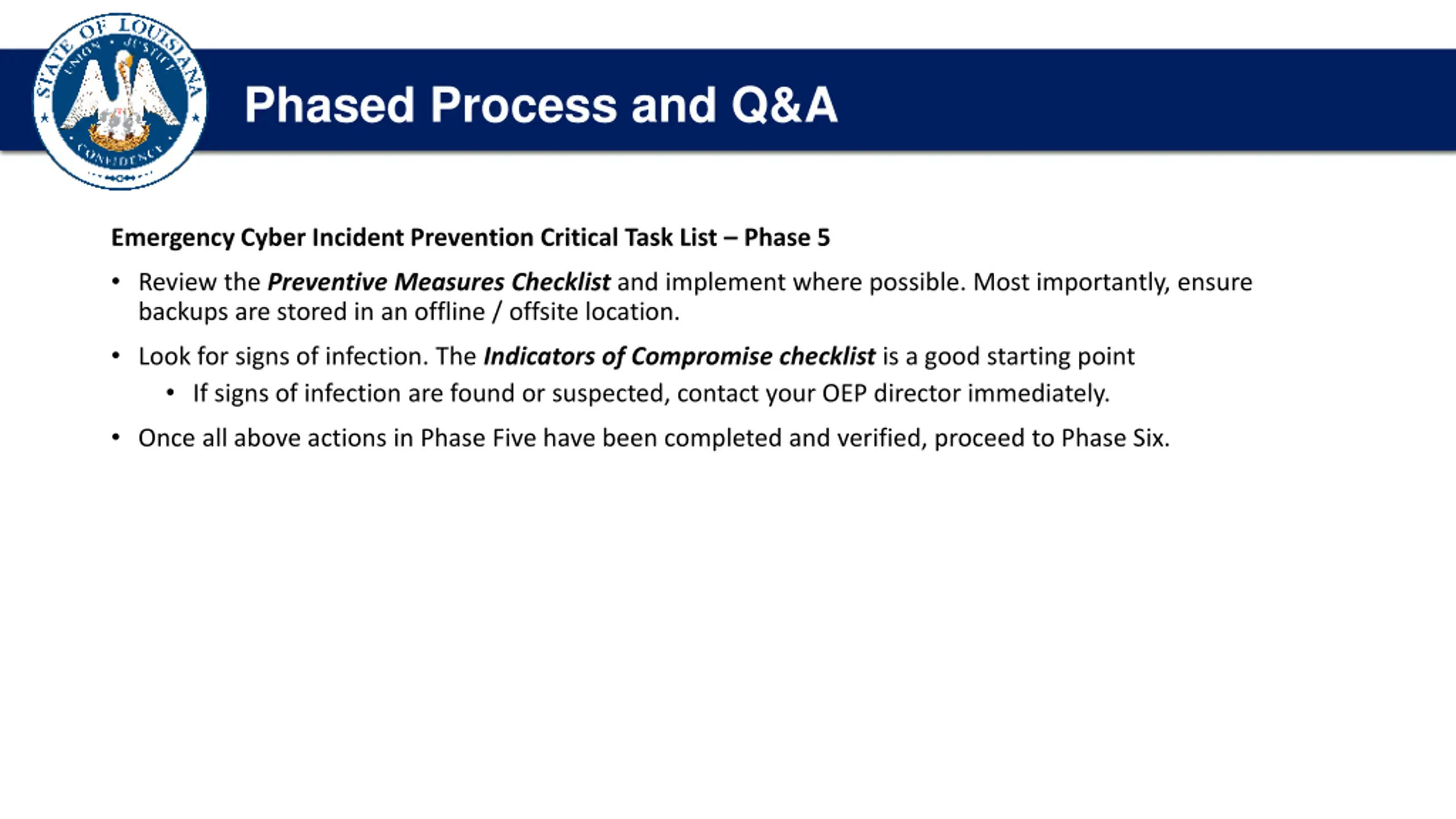 Introduction and Opening Comments Phased Process and Q&A Emergency Cyber Incident Prevention Critical Task List Phase 5 Review the Preventive Measures Checklist and implement where possible. Most importantly, ensure backups are stored in an offline / offsite location. Look for signs of infection. The Indicators of Compromise checklist is a good starting point If signs of infection are found or suspected, contact your OEP director immediately. Once all above actions in Phase Five have been completed and verified, proceed to Phase Six.