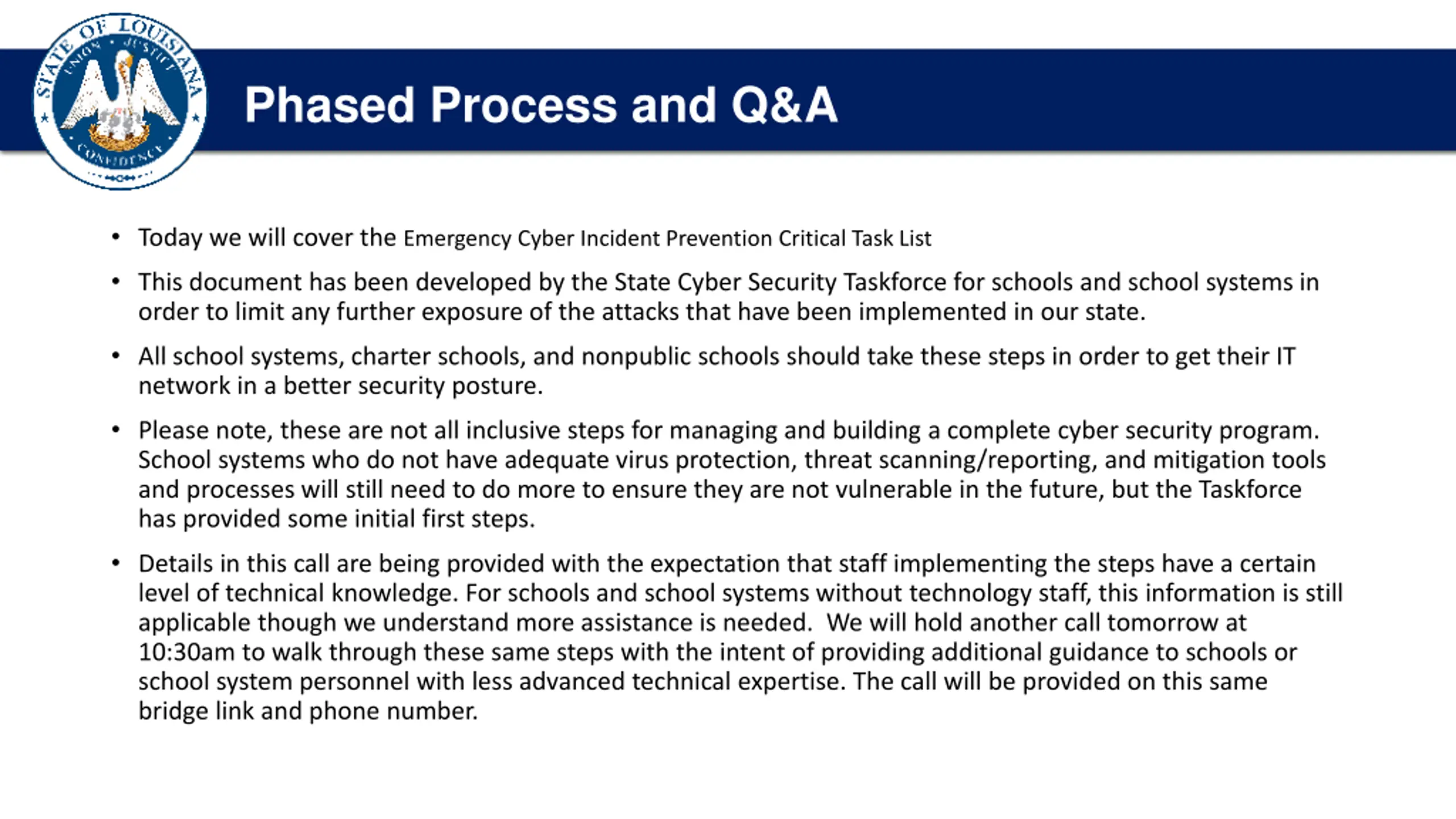 Introduction and Opening Comments Phased Process and Q&A Today we will cover the Emergency Cyber Incident Prevention Critical Task List This document has been developed by the State Cyber Security Taskforce for schools and school systems in order to limit any further exposure of the attacks that have been implemented in our state. All school systems, charter schools, and nonpublic schools should take these steps in order to get their IT network in a better security posture. Please note, these are not all inclusive steps for managing and building a complete cyber security program. School systems who do not have adequate virus protection, threat scanning/reporting, and mitigation tools and processes will still need to do more to ensure they are not vulnerable in the future, but the Taskforce has provided some initial first steps. Details in this call are being provided with the expectation that staff implementing the steps have a certain level of technical knowledge. For schools and school systems without technology staff, this information is still applicable though we understand more assistance is needed. We will hold another call tomorrow at 10:30am to walk through these same steps with the intent of providing additional guidance to schools or school system personnel with less advanced technical expertise. The call will be provided on this same bridge link and phone number.