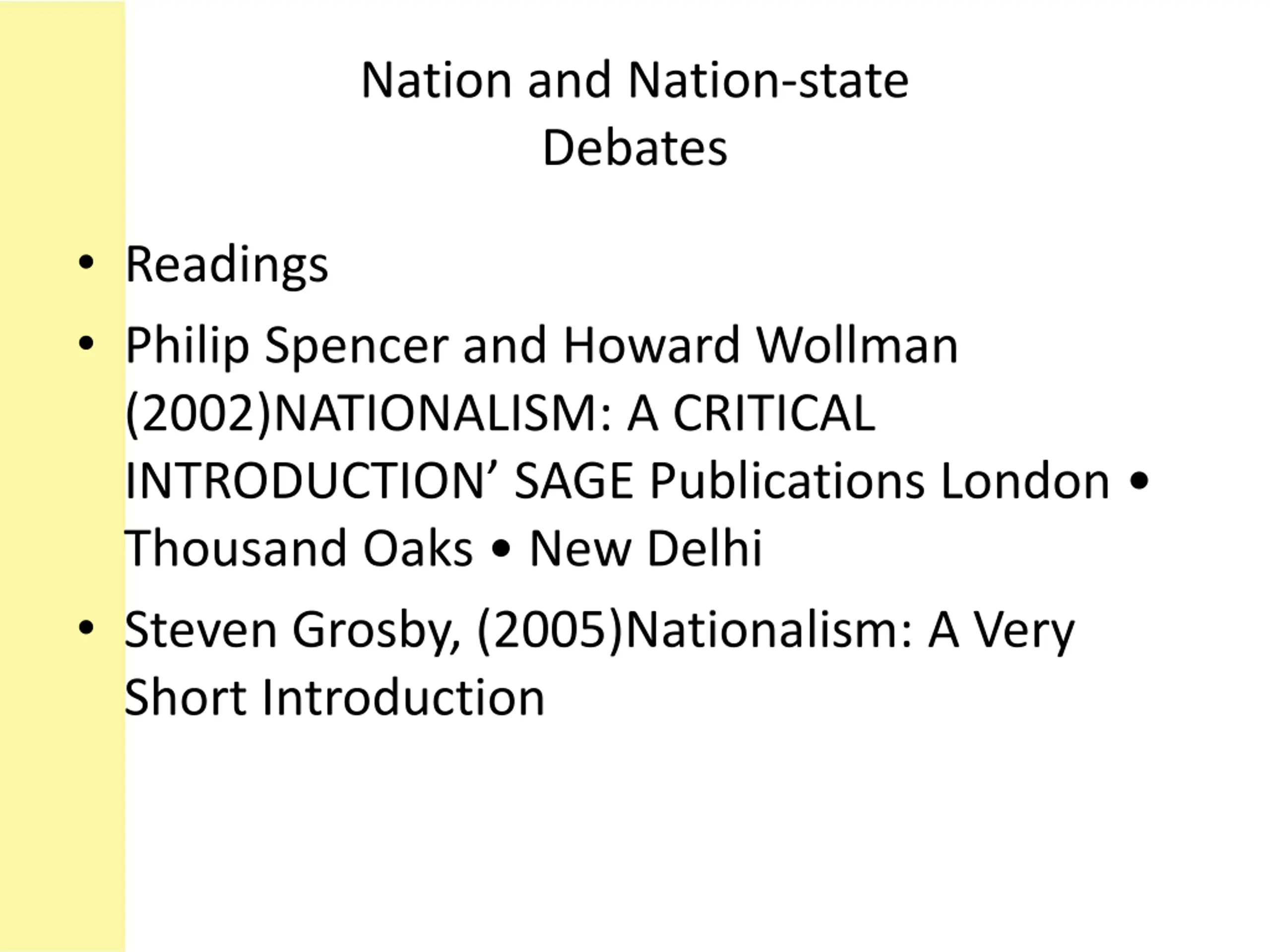 Nation and Nation-state Debates Readings Philip Spencer and Howard Wollman (2002)NATIONALISM: A CRITICAL INTRODUCTION SAGE Publications London Thousand Oaks New Delhi Steven Grosby, (2005)Nationalism: A Very Short Introduction