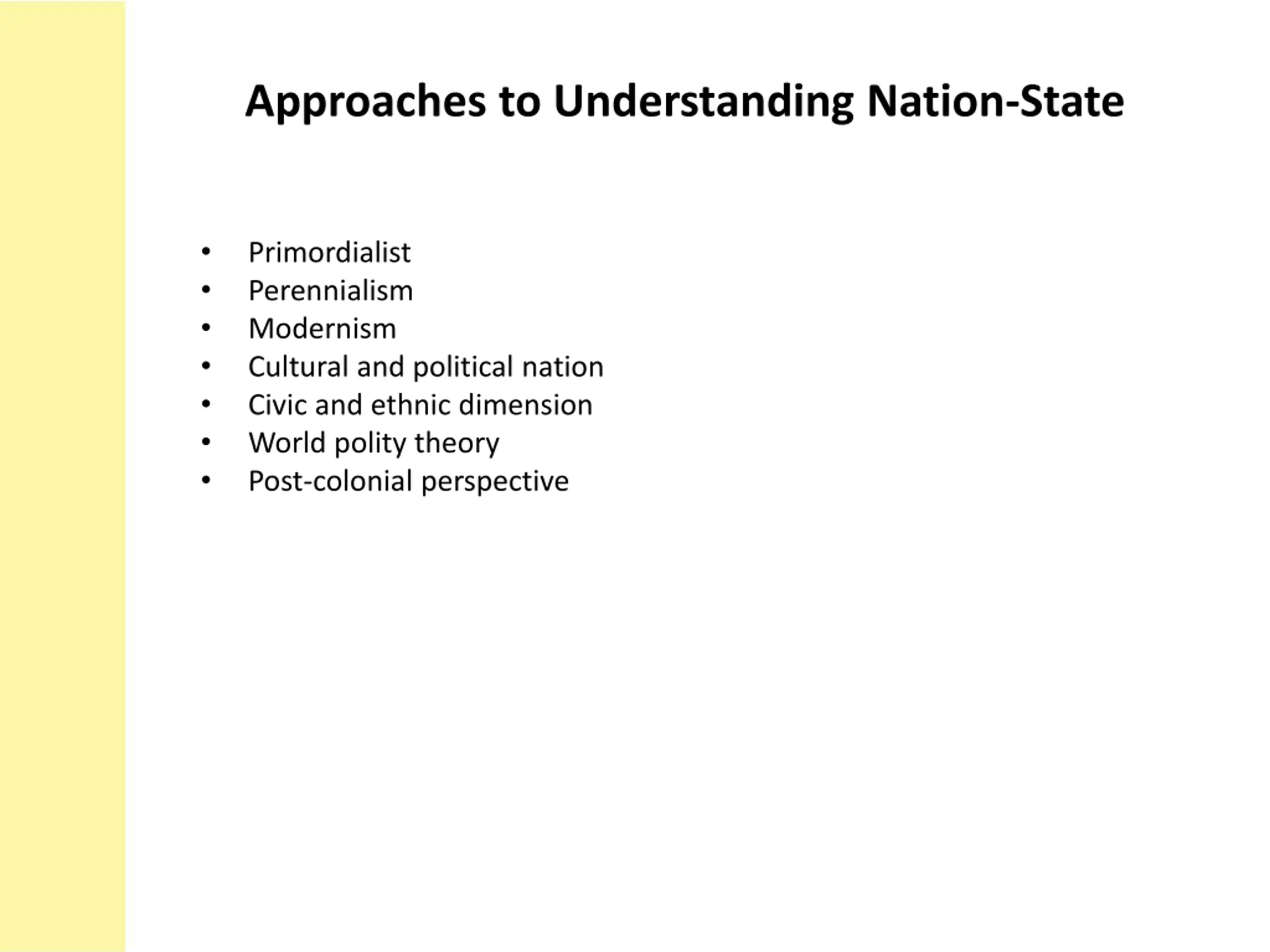 Approaches to Understanding Nation-State Primordialist Perennialism Modernism Cultural and political nation Civic and ethnic dimension World polity theory Post-colonial perspective