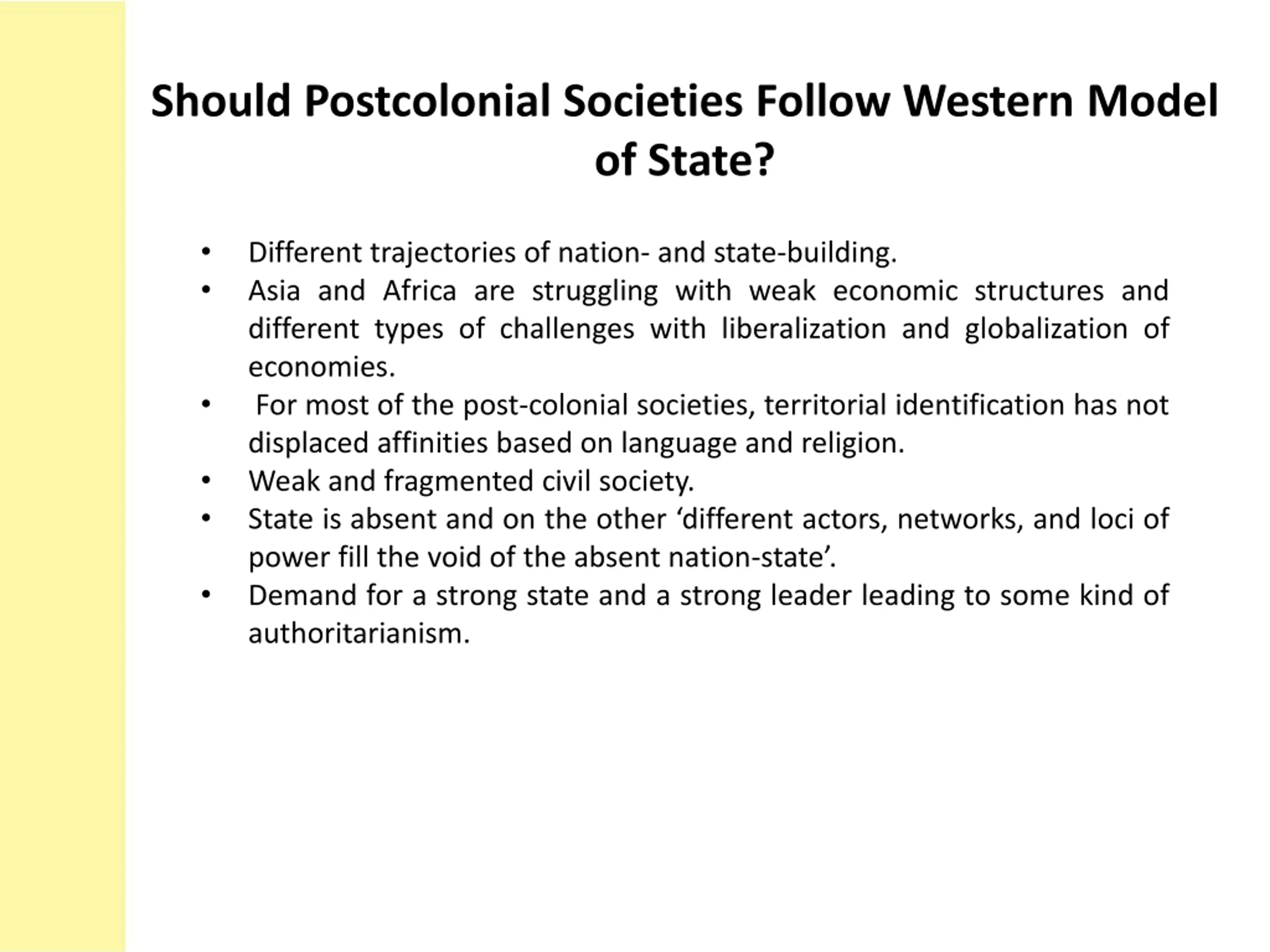 Should Postcolonial Societies Follow Western Model of State? Different trajectories of nation- and state-building. Asia and Africa are struggling with weak economic structures and different types of challenges with liberalization and globalization of economies. For most of the post-colonial societies, territorial identification has not displaced affinities based on language and religion. Weak and fragmented civil society. State is absent and on the other different actors, networks, and loci of power fill the void of the absent nation-state . Demand for a strong state and a strong leader leading to some kind of authoritarianism.