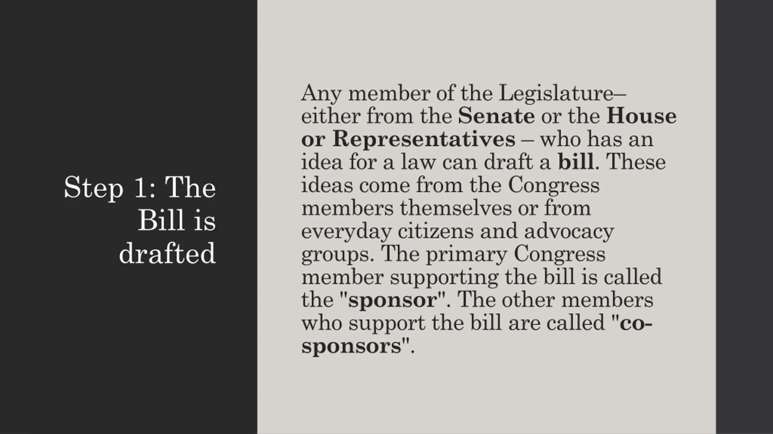 Any member of the Legislature either from the Senate or the House or Representatives who has an idea for a law can draft a bill. These ideas come from the Congress members themselves or from everyday citizens and advocacy groups. The primary Congress member supporting the bill is called the "sponsor". The other members who support the bill are called "co- sponsors". Step 1: The Bill is drafted