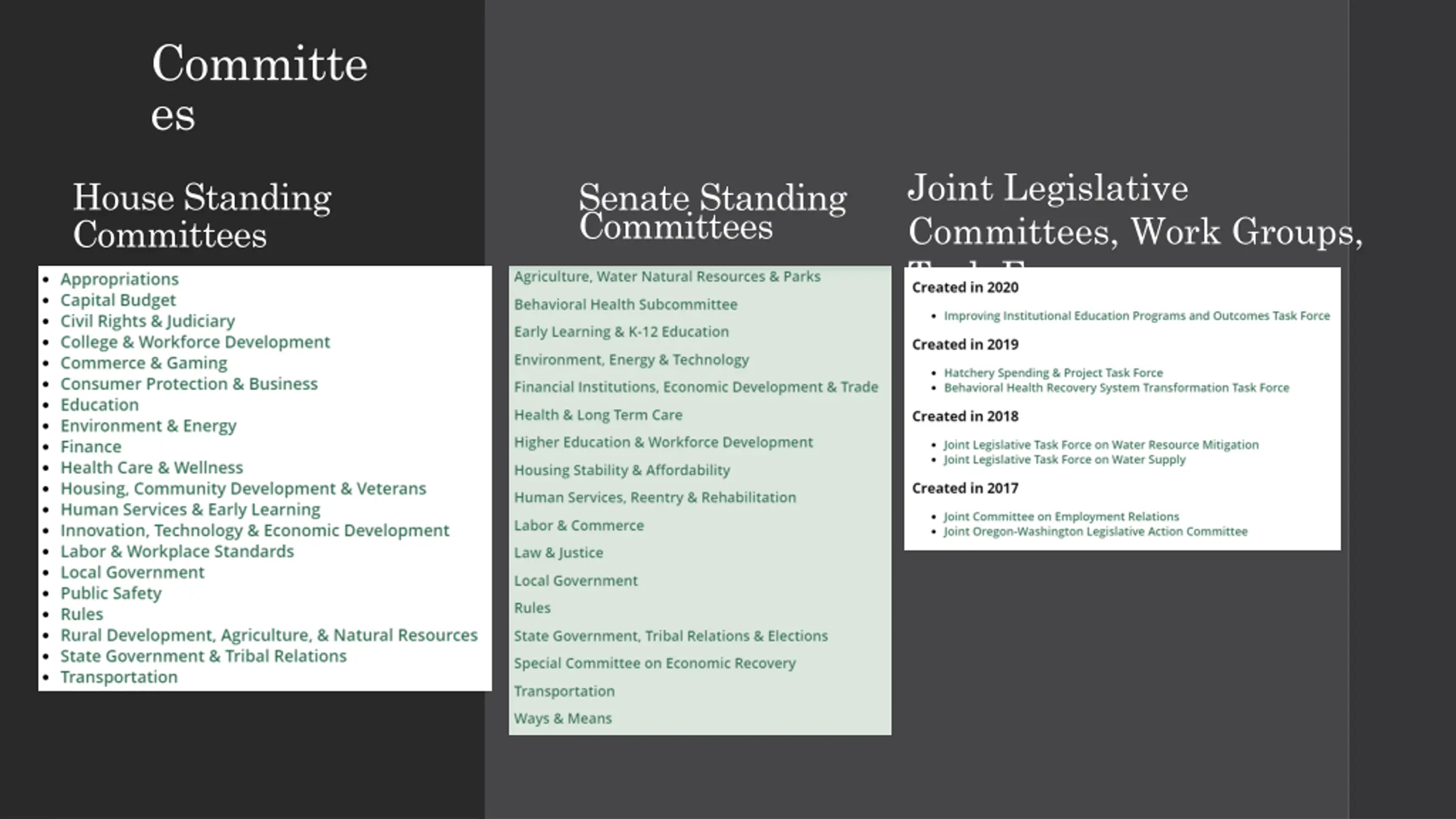 Committe es Joint Legislative Committees, Work Groups, Task Forces House Standing Committees Senate Standing Committees