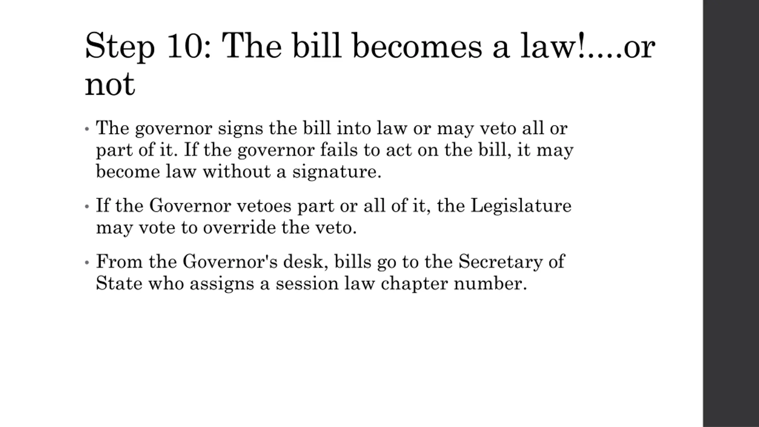 Step 10: The bill becomes a law!....or not The governor signs the bill into law or may veto all or part of it. If the governor fails to act on the bill, it may become law without a signature. If the Governor vetoes part or all of it, the Legislature may vote to override the veto. From the Governor's desk, bills go to the Secretary of State who assigns a session law chapter number.