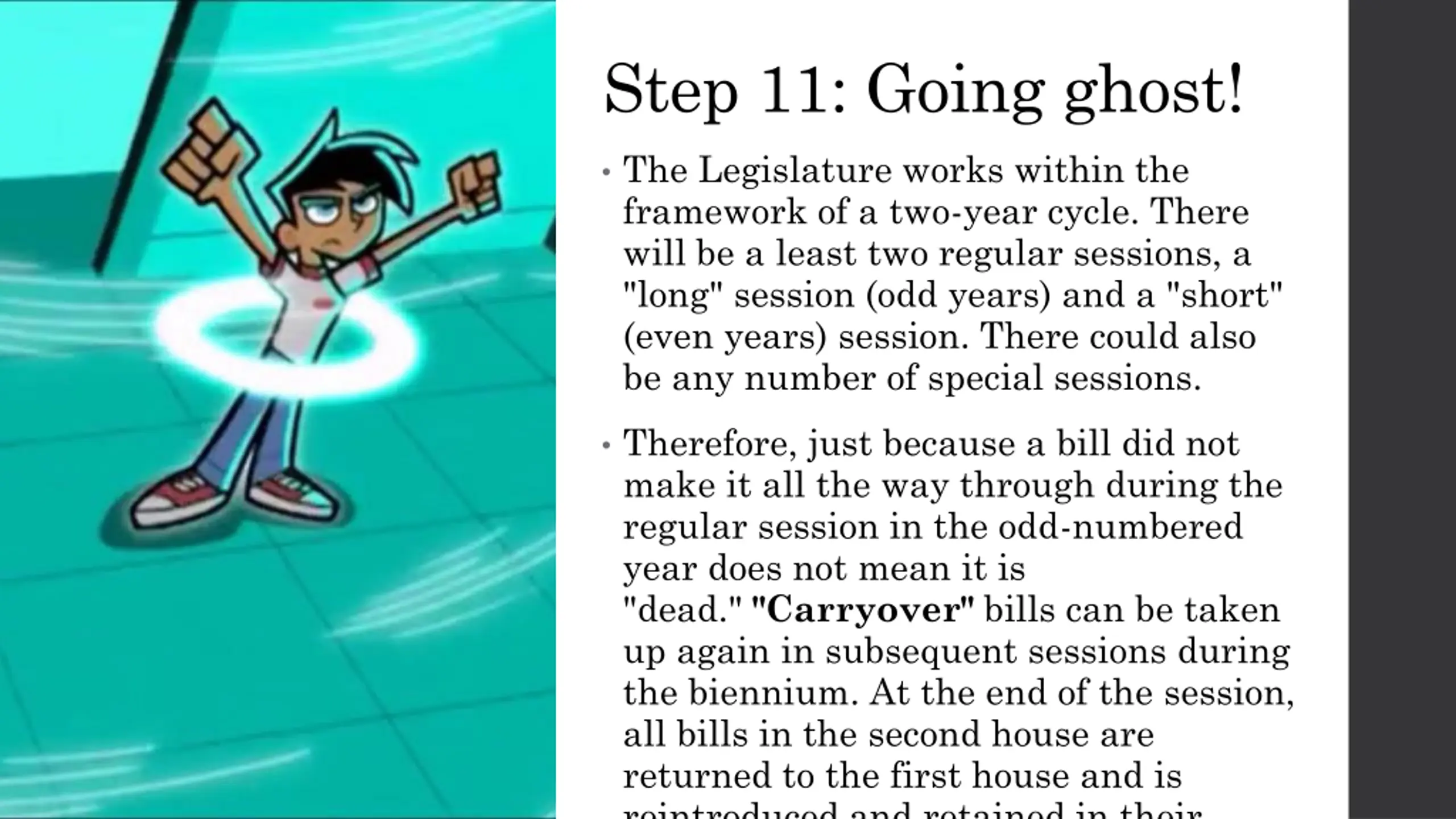 Step 11: Going ghost! The Legislature works within the framework of a two-year cycle. There will be a least two regular sessions, a "long" session (odd years) and a "short" (even years) session. There could also be any number of special sessions. Therefore, just because a bill did not make it all the way through during the regular session in the odd-numbered year does not mean it is "dead." "Carryover" bills can be taken up again in subsequent sessions during the biennium. At the end of the session, all bills in the second house are returned to the first house and is reintroduced and retained in their