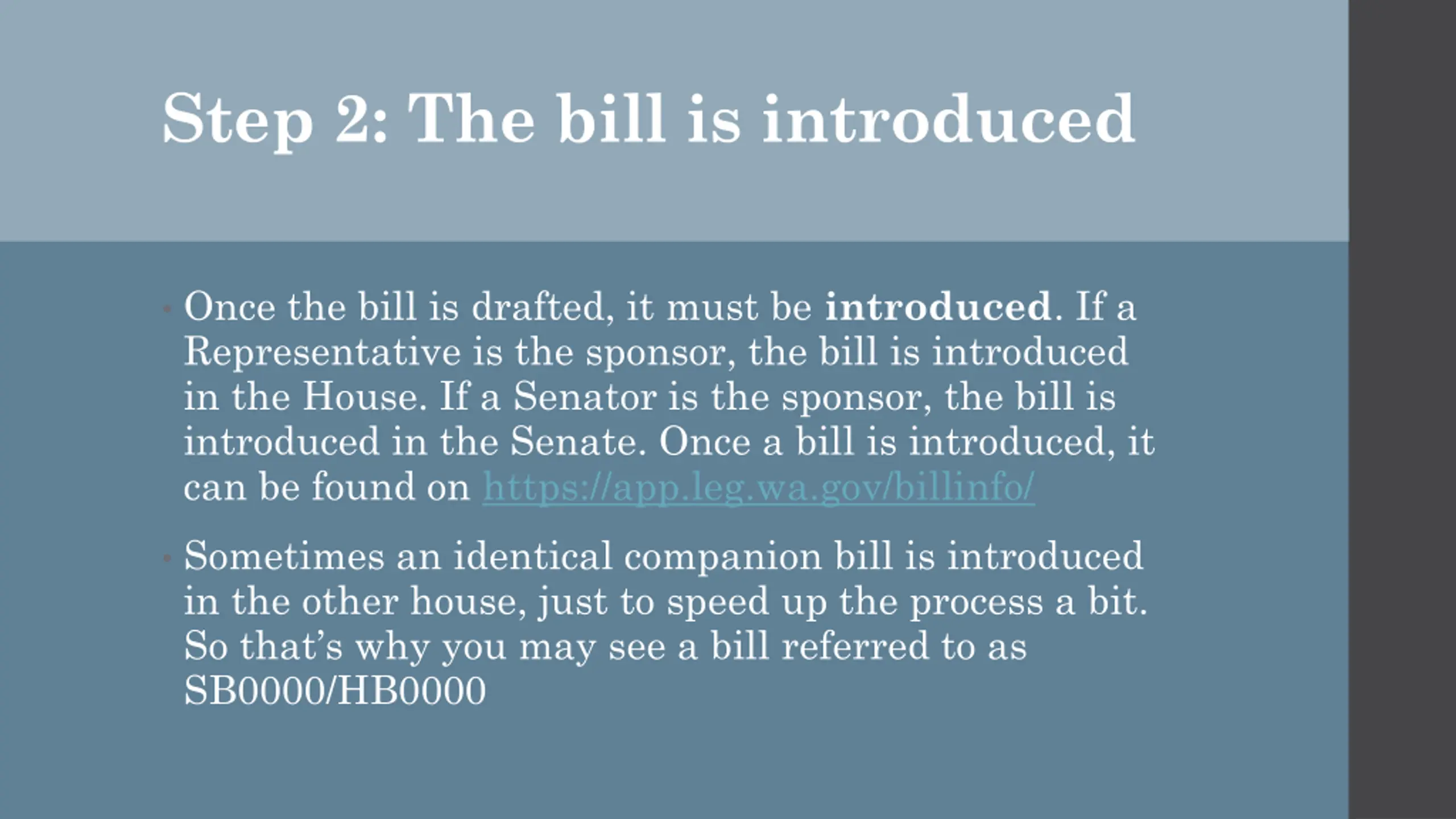 Step 2: The bill is introduced Once the bill is drafted, it must be introduced. If a Representative is the sponsor, the bill is introduced in the House. If a Senator is the sponsor, the bill is introduced in the Senate. Once a bill is introduced, it can be found on https://app.leg.wa.gov/billinfo/ Sometimes an identical companion bill is introduced in the other house, just to speed up the process a bit. So that s why you may see a bill referred to as SB0000/HB0000