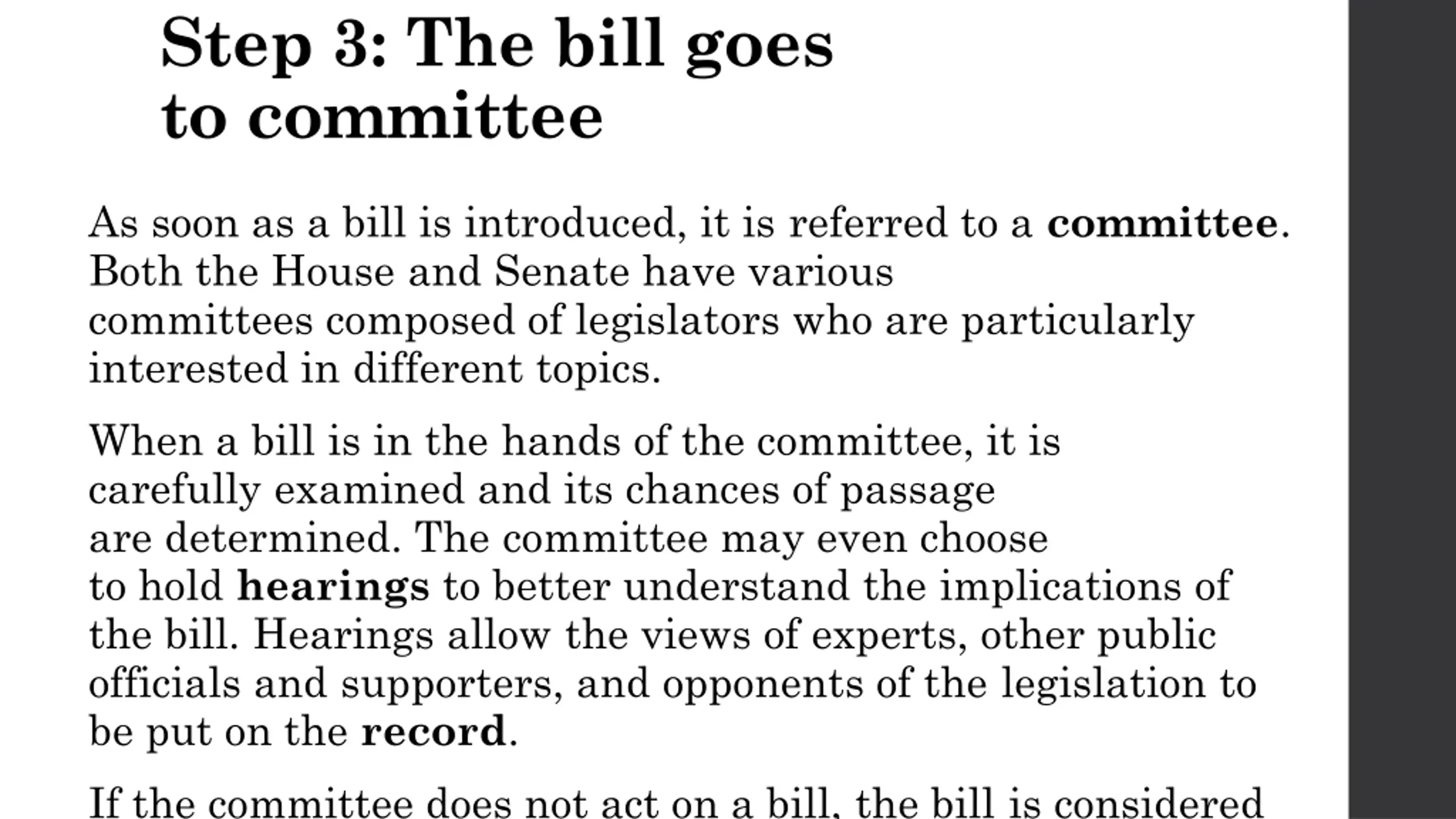 Step 3: The bill goes to committee As soon as a bill is introduced, it is referred to a committee. Both the House and Senate have various committees composed of legislators who are particularly interested in different topics. When a bill is in the hands of the committee, it is carefully examined and its chances of passage are determined. The committee may even choose to hold hearings to better understand the implications of the bill. Hearings allow the views of experts, other public officials and supporters, and opponents of the legislation to be put on the record. If the committee does not act on a bill, the bill is considered