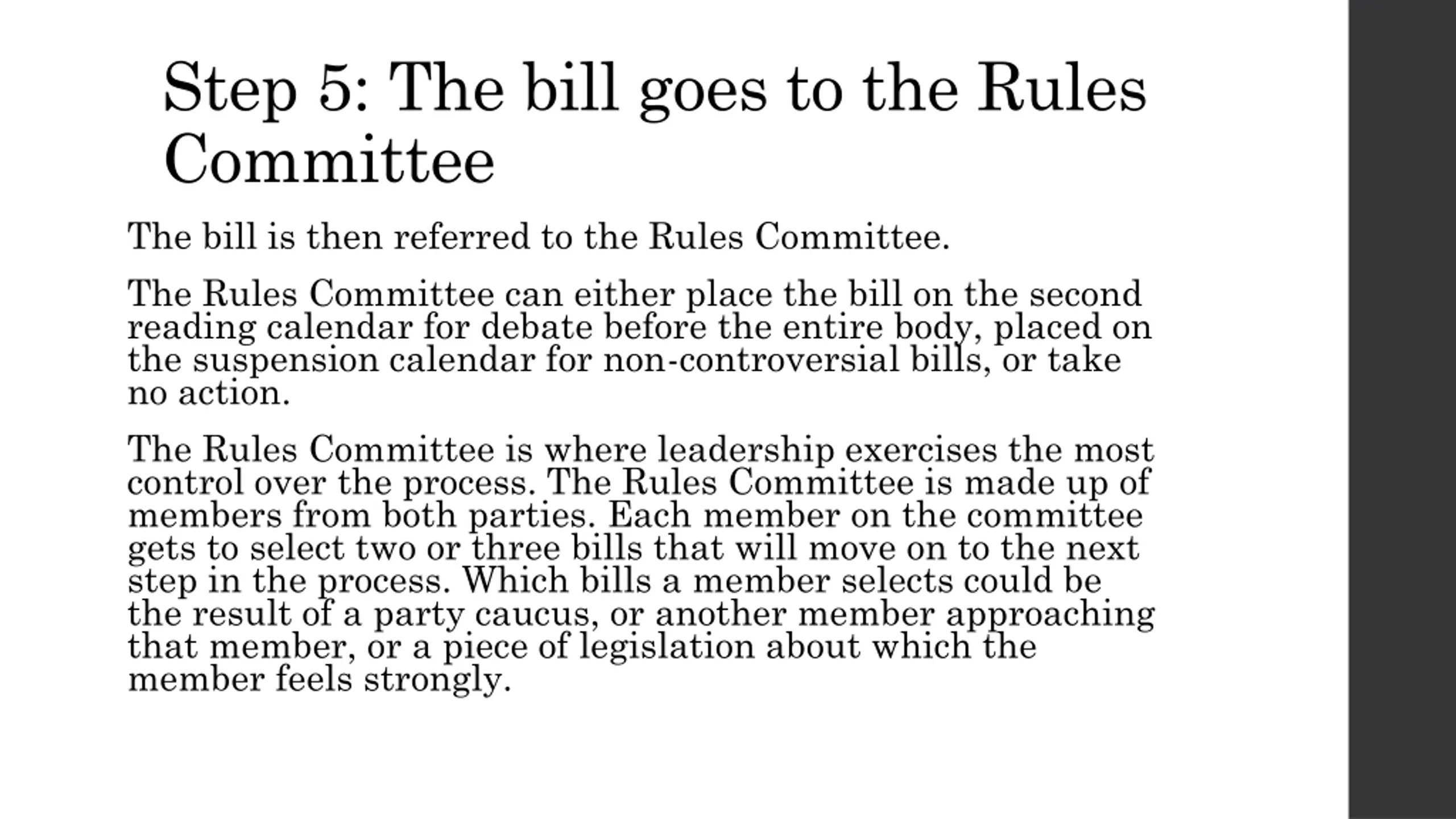Step 5: The bill goes to the Rules Committee The bill is then referred to the Rules Committee. The Rules Committee can either place the bill on the second reading calendar for debate before the entire body, placed on the suspension calendar for non-controversial bills, or take no action. The Rules Committee is where leadership exercises the most control over the process. The Rules Committee is made up of members from both parties. Each member on the committee gets to select two or three bills that will move on to the next step in the process. Which bills a member selects could be the result of a party caucus, or another member approaching that member, or a piece of legislation about which the member feels strongly.