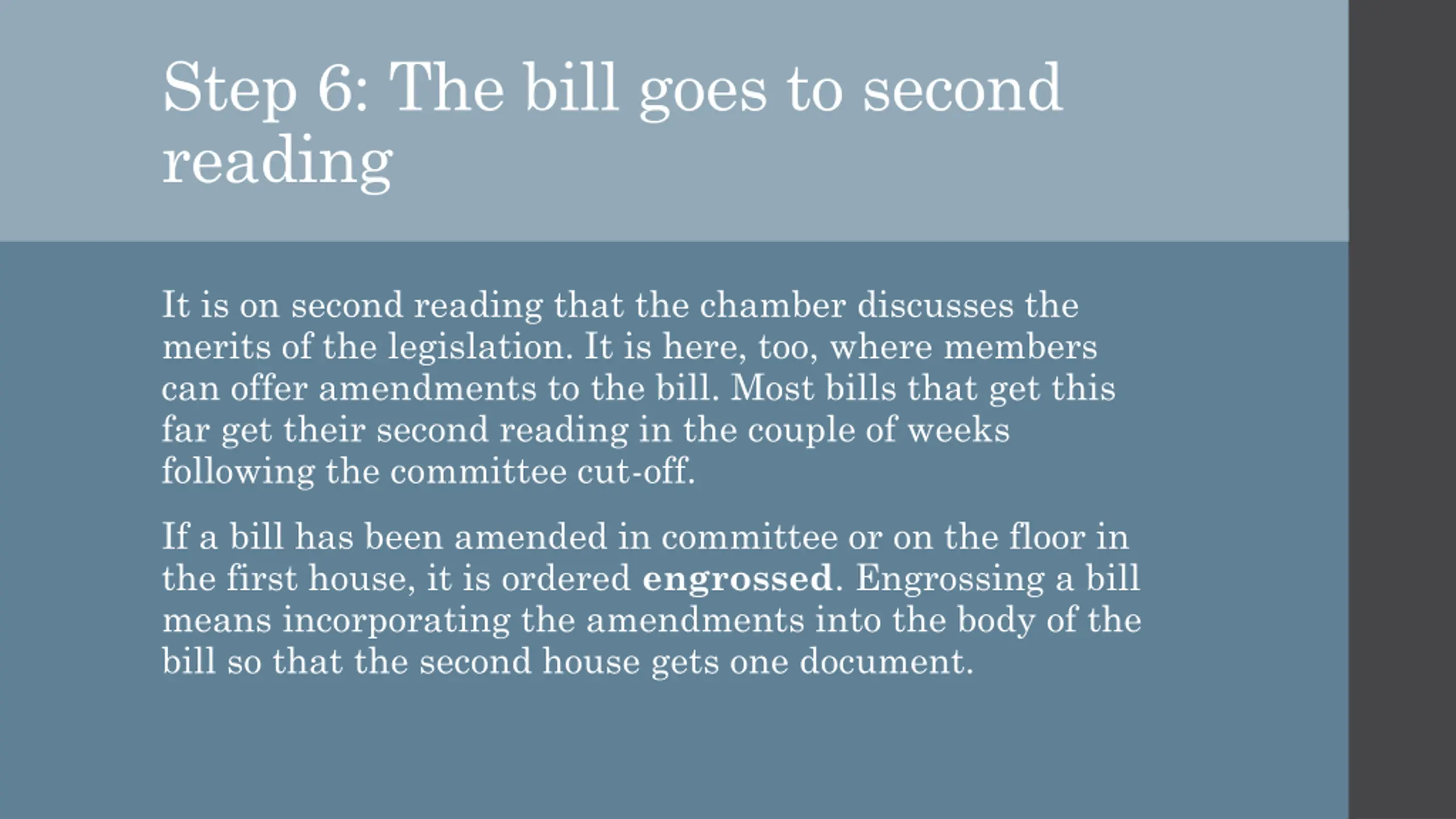 Step 6: The bill goes to second reading It is on second reading that the chamber discusses the merits of the legislation. It is here, too, where members can offer amendments to the bill. Most bills that get this far get their second reading in the couple of weeks following the committee cut-off. If a bill has been amended in committee or on the floor in the first house, it is ordered engrossed. Engrossing a bill means incorporating the amendments into the body of the bill so that the second house gets one document.