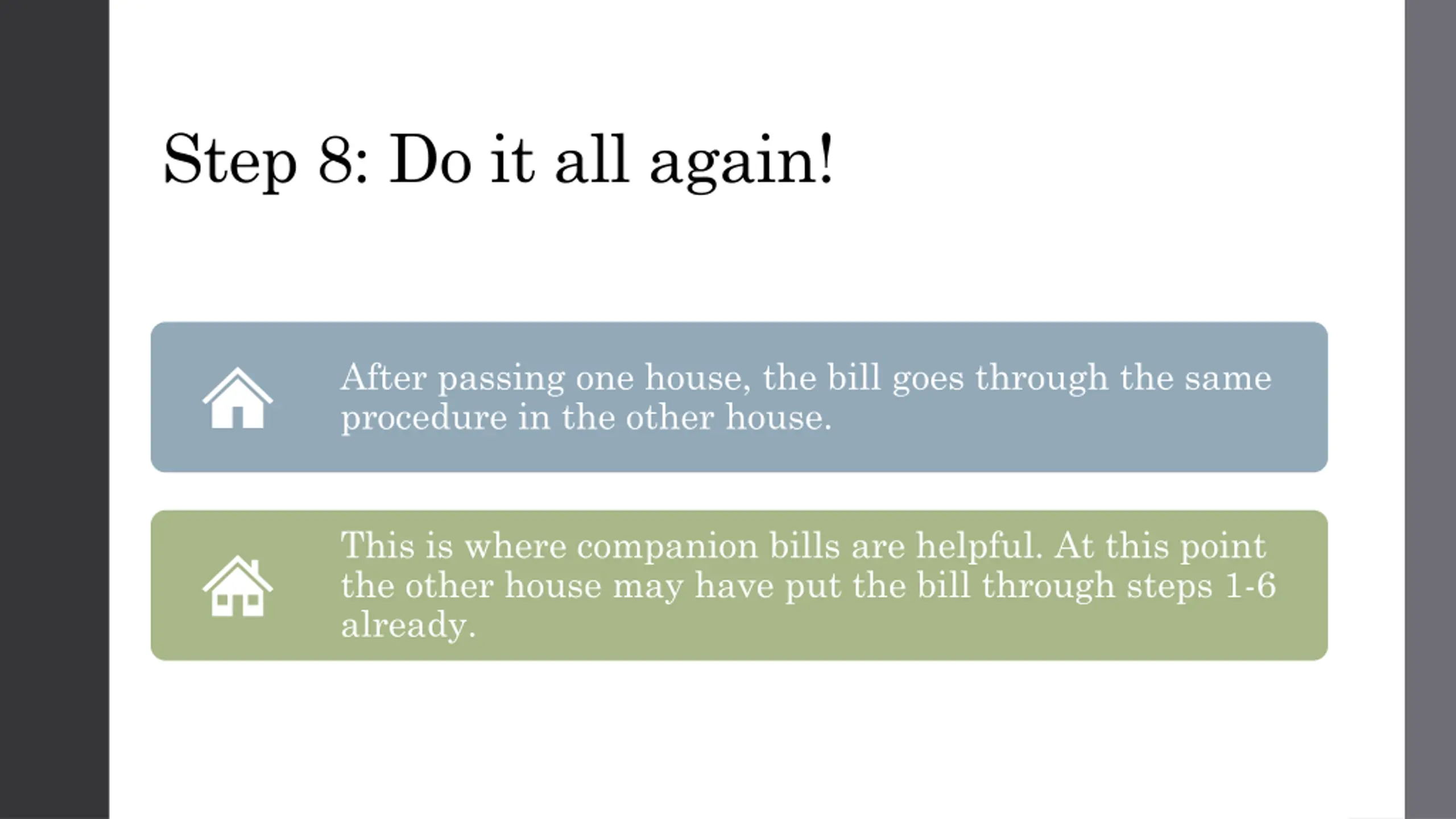 Step 8: Do it all again! After passing one house, the bill goes through the same procedure in the other house. This is where companion bills are helpful. At this point the other house may have put the bill through steps 1-6 already.